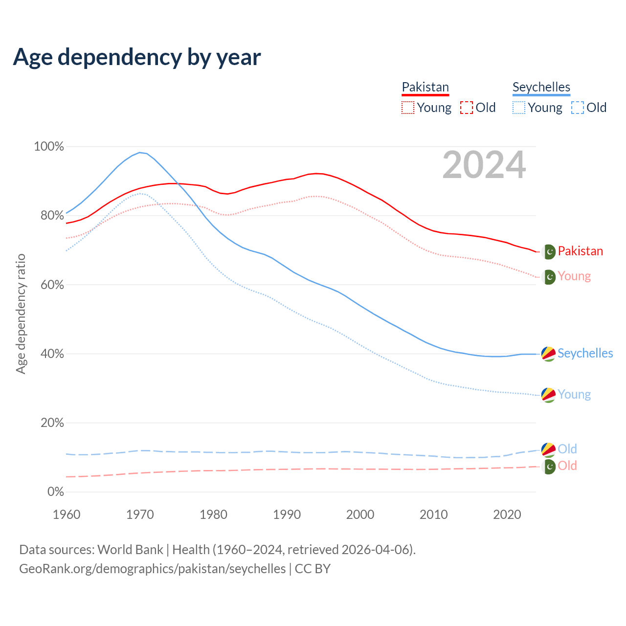 - Pakistan is ranked 154/196 by median age (oldest to youngest) vs 76/196 for the Seychelles.