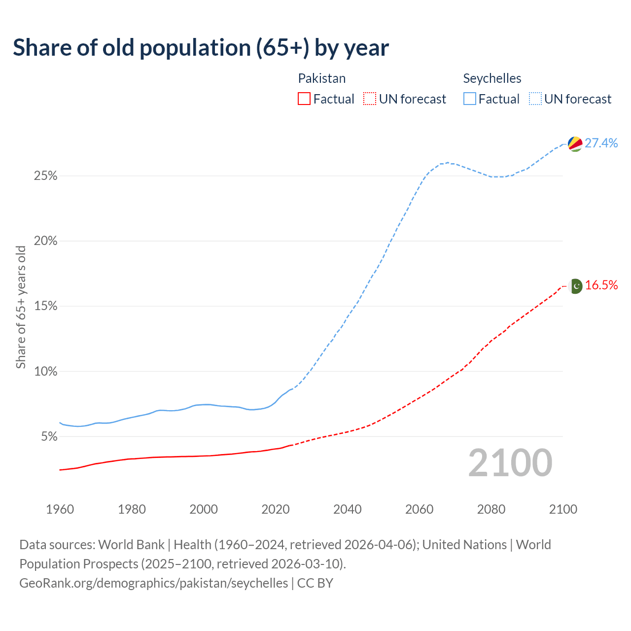 The share of older people aged 65 and over is 4.28% in Pakistan and 8.54% in the Seychelles. Life expectancy in Pakistan compared to the Seychelles .