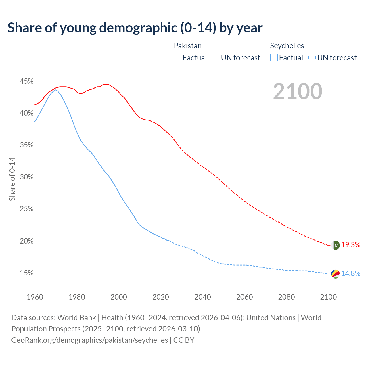 - The share of young demographic (0-15 years old) in Pakistan is 36.7% vs 20% in the Seychelles.