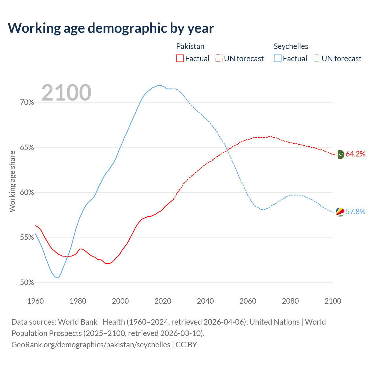 - Pakistan has 154M working age adults (aged 15-64) vs 90.3K in the Seychelles.