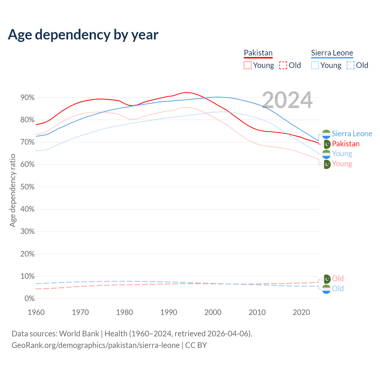 - The share of old-age demographic (65+) in Pakistan is 4.28% vs 3.24% in Sierra Leone.