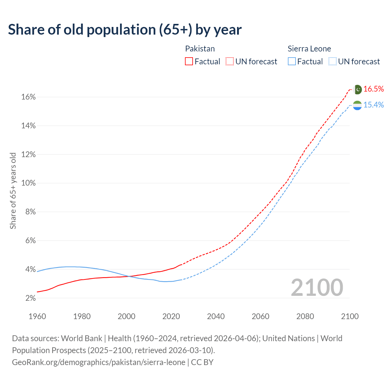 The share of older people aged 65 and over is 4.28% in Pakistan and 3.24% in Sierra Leone. Life expectancy in Pakistan compared to Sierra Leone .