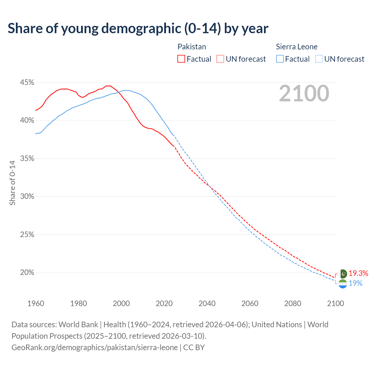- Pakistan is ranked 154/196 by median age (oldest to youngest) vs 161/196 for Sierra Leone.