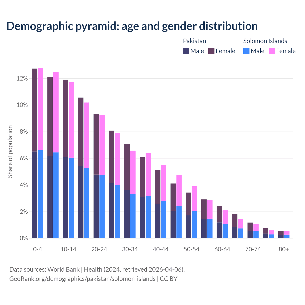 - Pakistan is ranked 154/196 by median age (oldest to youngest) vs 153/196 for the Solomon Islands.