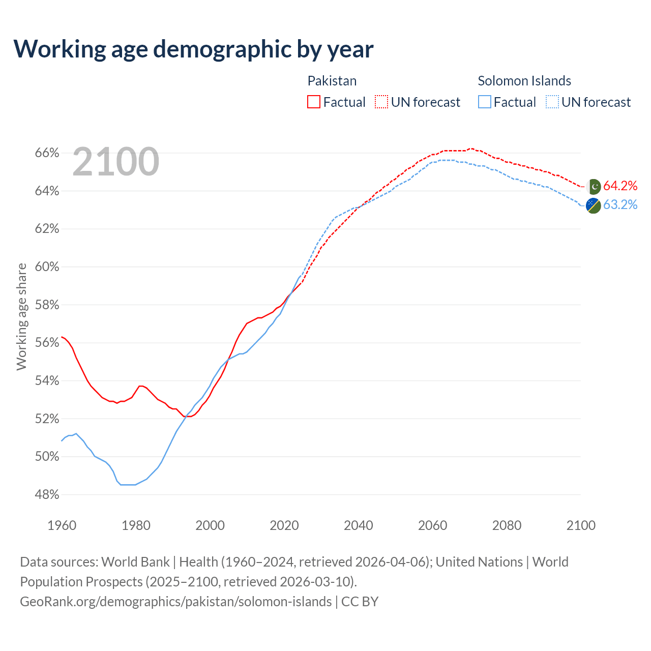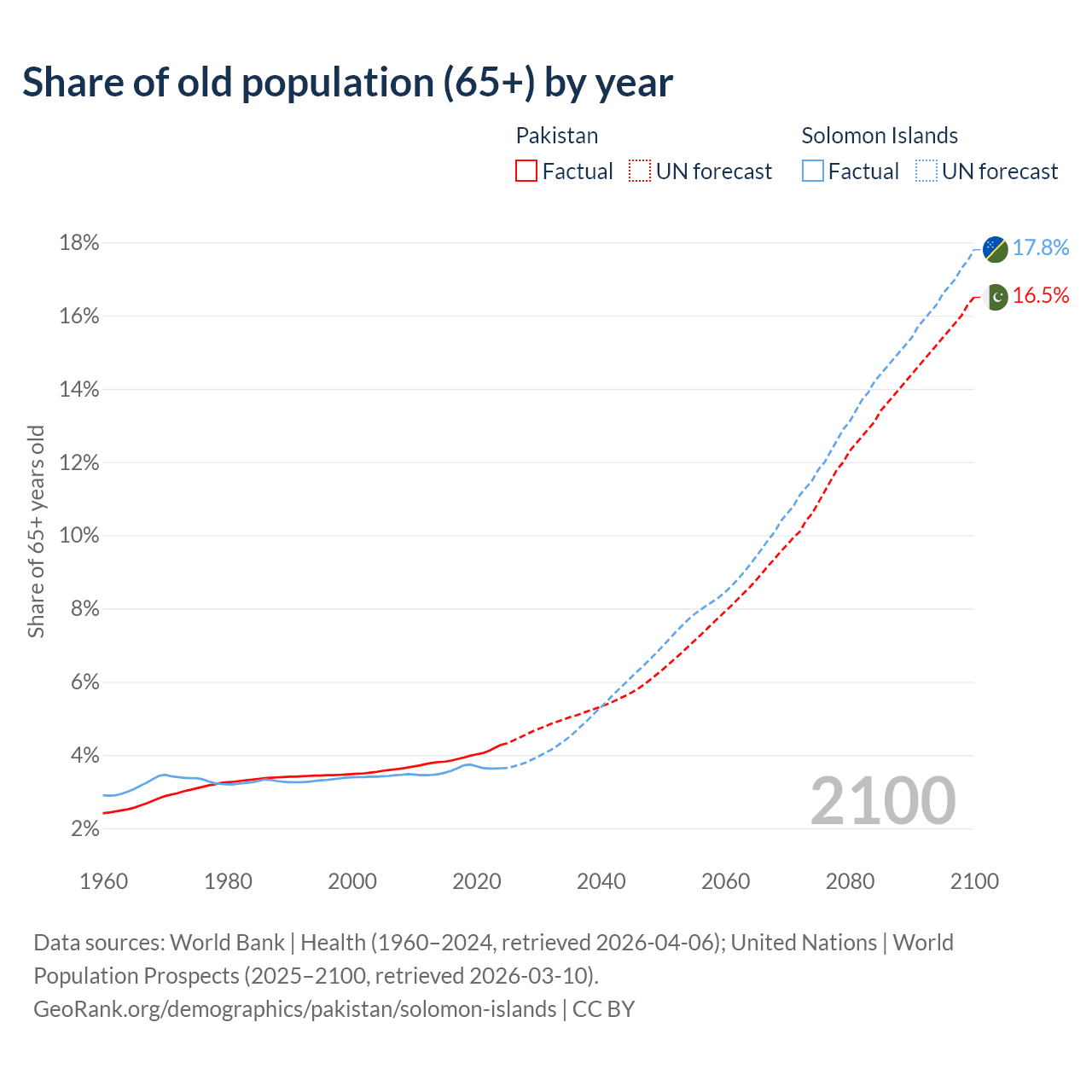 The share of older people aged 65 and over is 4.28% in Pakistan and 3.64% in the Solomon Islands. Life expectancy in Pakistan compared to the Solomon Islands .