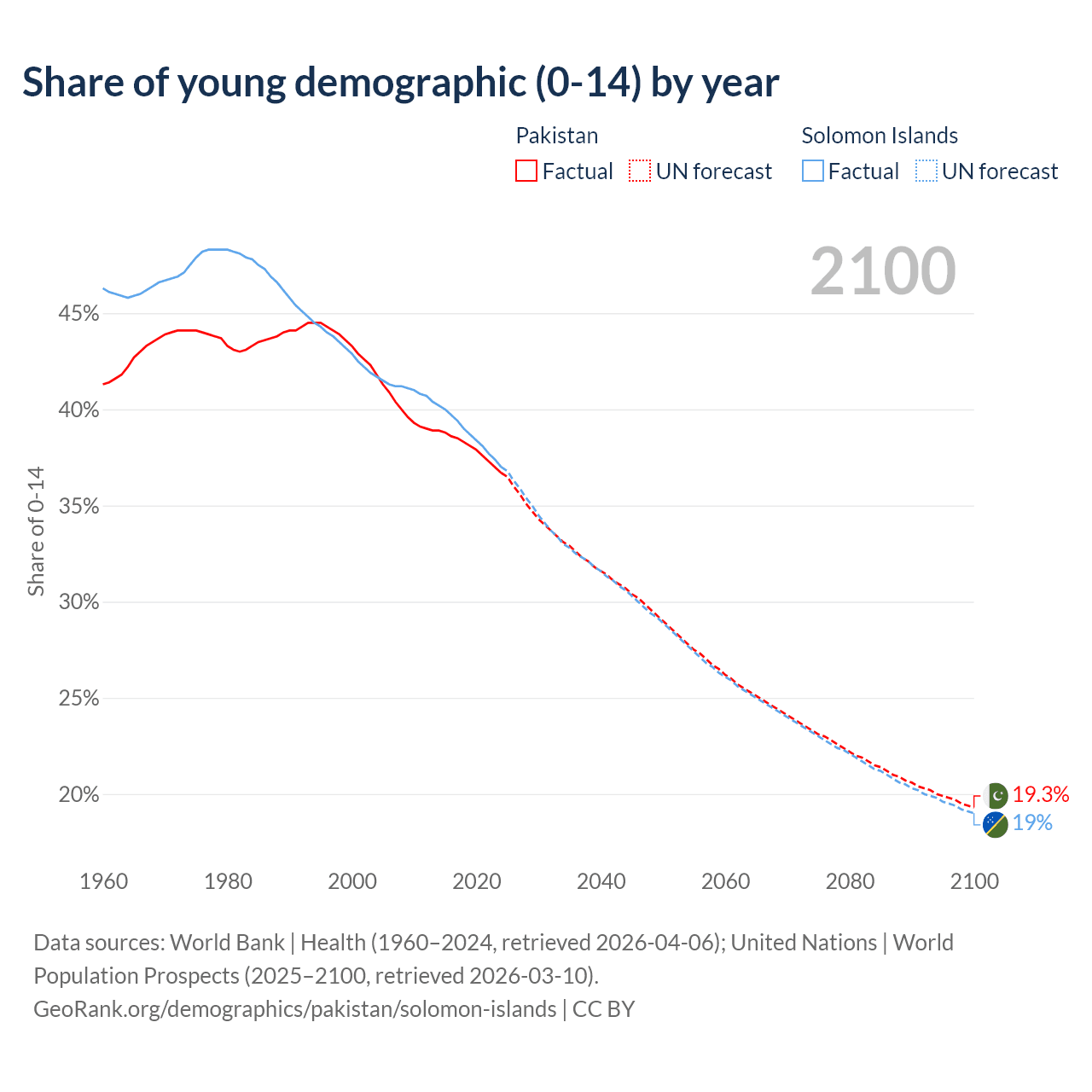 - The share of young demographic (0-15 years old) in Pakistan is 36.7% vs 37% in the Solomon Islands.