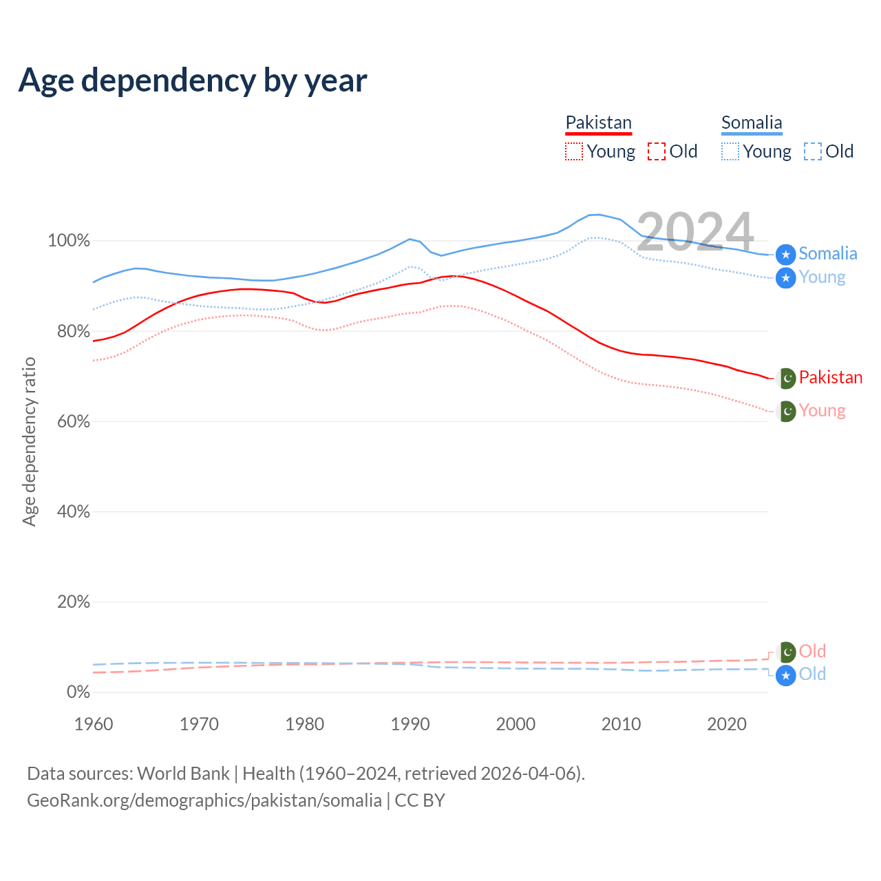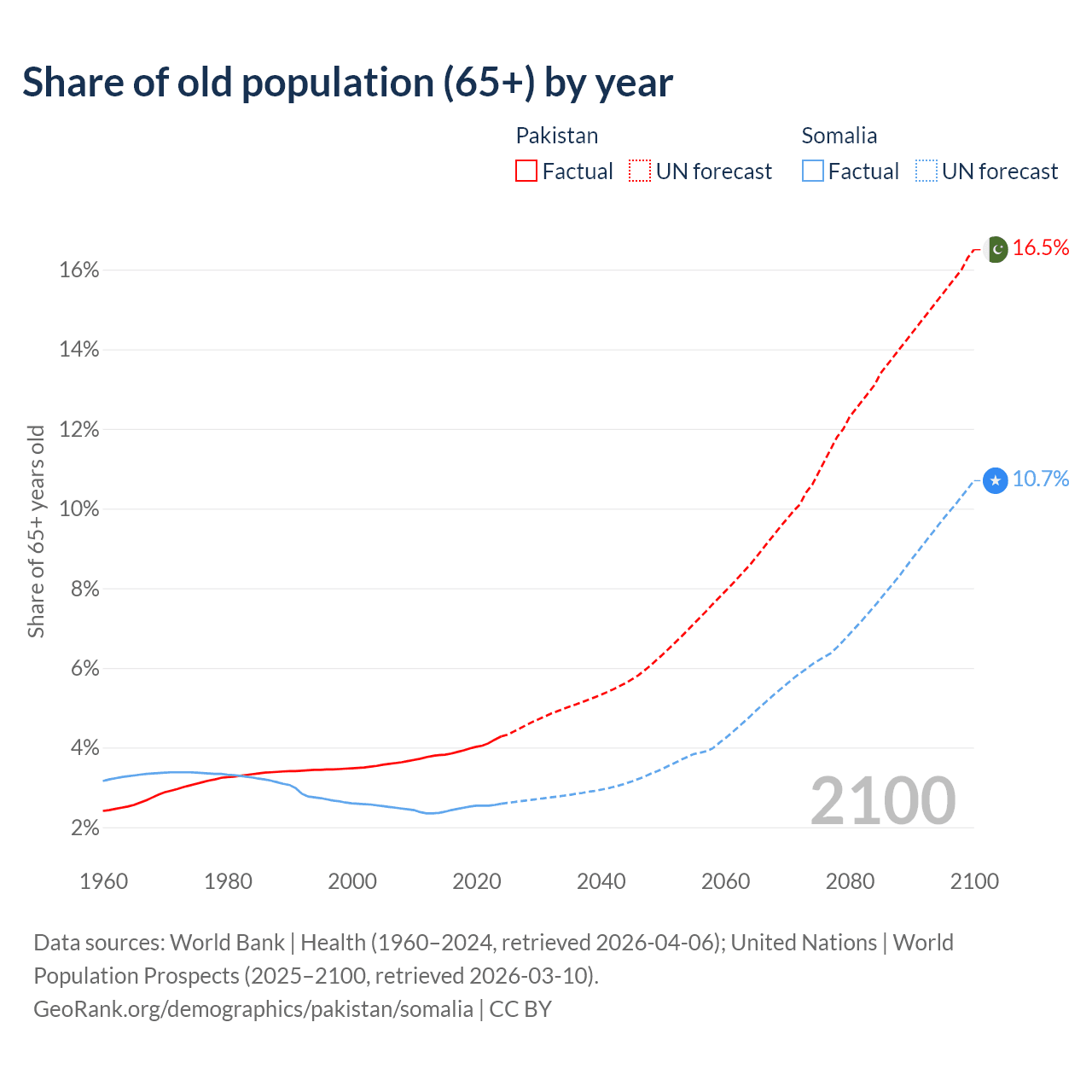 - The share of old-age demographic (65+) in Pakistan is 4.28% vs 2.59% in Somalia.