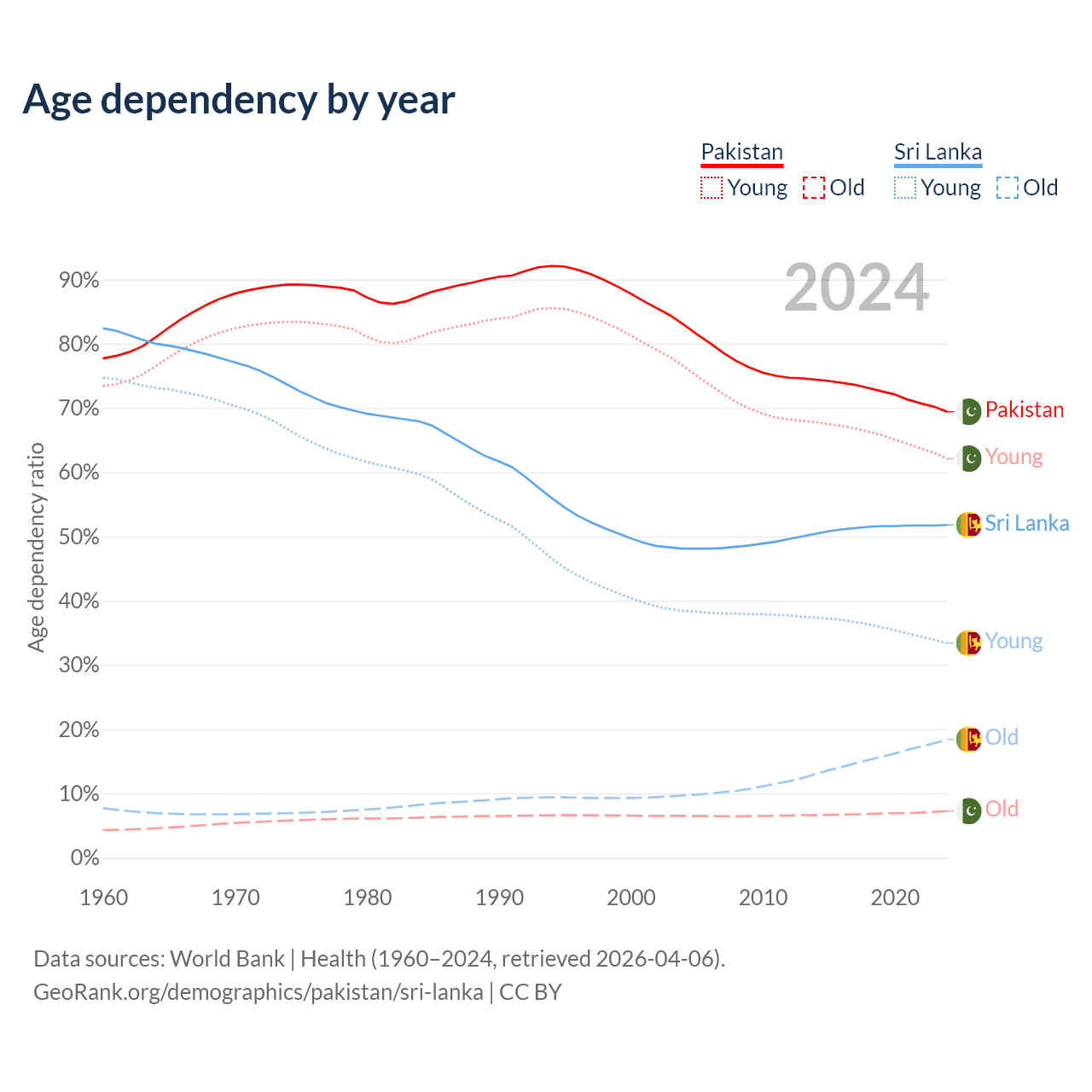 - Pakistan is ranked 154/196 by median age (oldest to youngest) vs 81/196 for Sri Lanka.