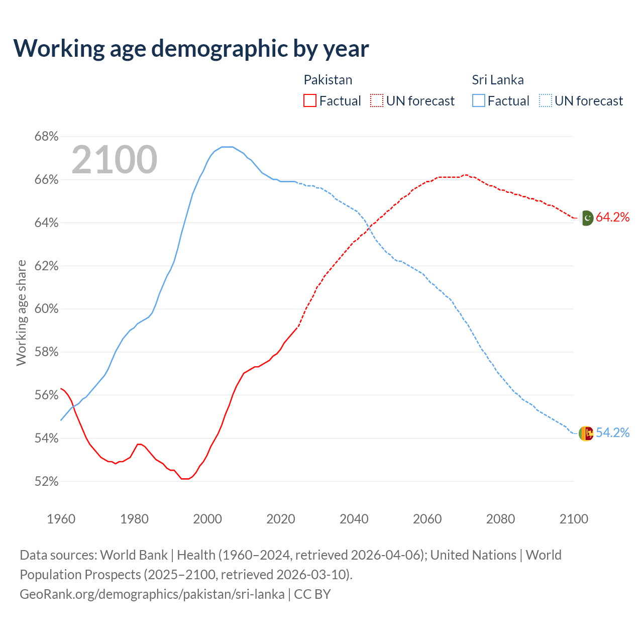 - Pakistan has 154M working age adults (aged 15-64) vs 14.6M in Sri Lanka.