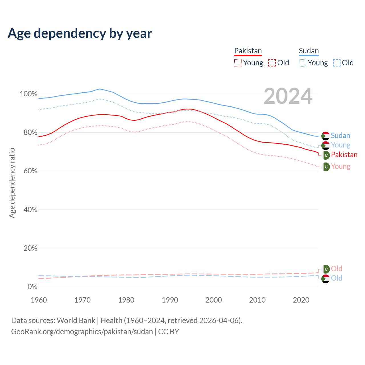 - Pakistan is ranked 154/196 by median age (oldest to youngest) vs 172/196 for Sudan.