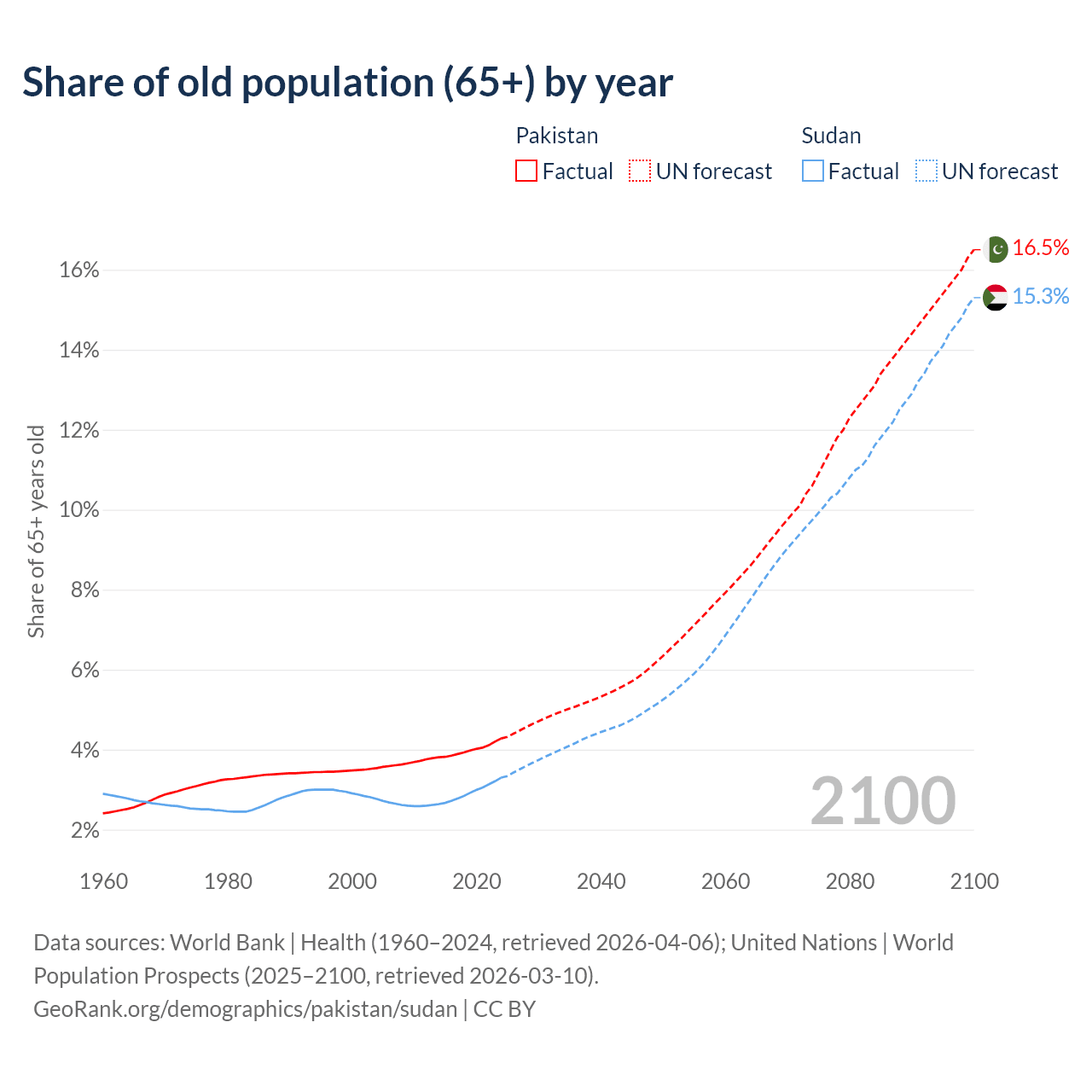 - The share of old-age demographic (65+) in Pakistan is 4.28% vs 3.3% in Sudan.