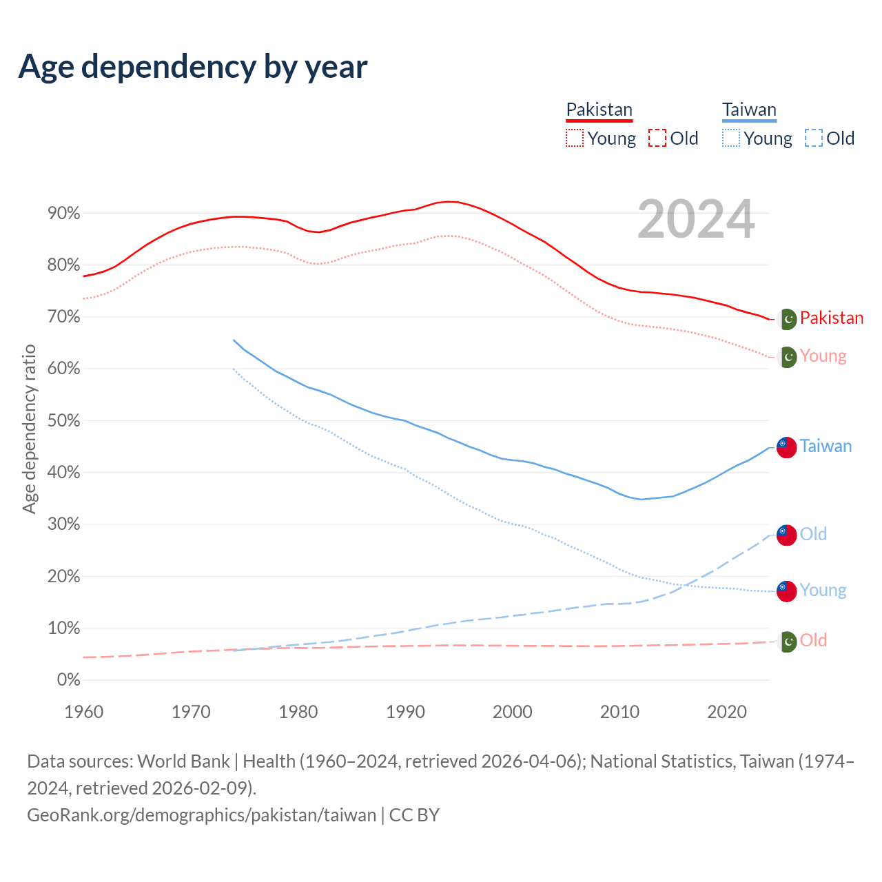 Data sources: World Bank | Health (1960–2024, retrieved 2026-04-06); U.S. Census Bureau (1960–2024, retrieved 2026-02-08); National Statistics, Taiwan (1974–2024, retrieved 2026-02-09).