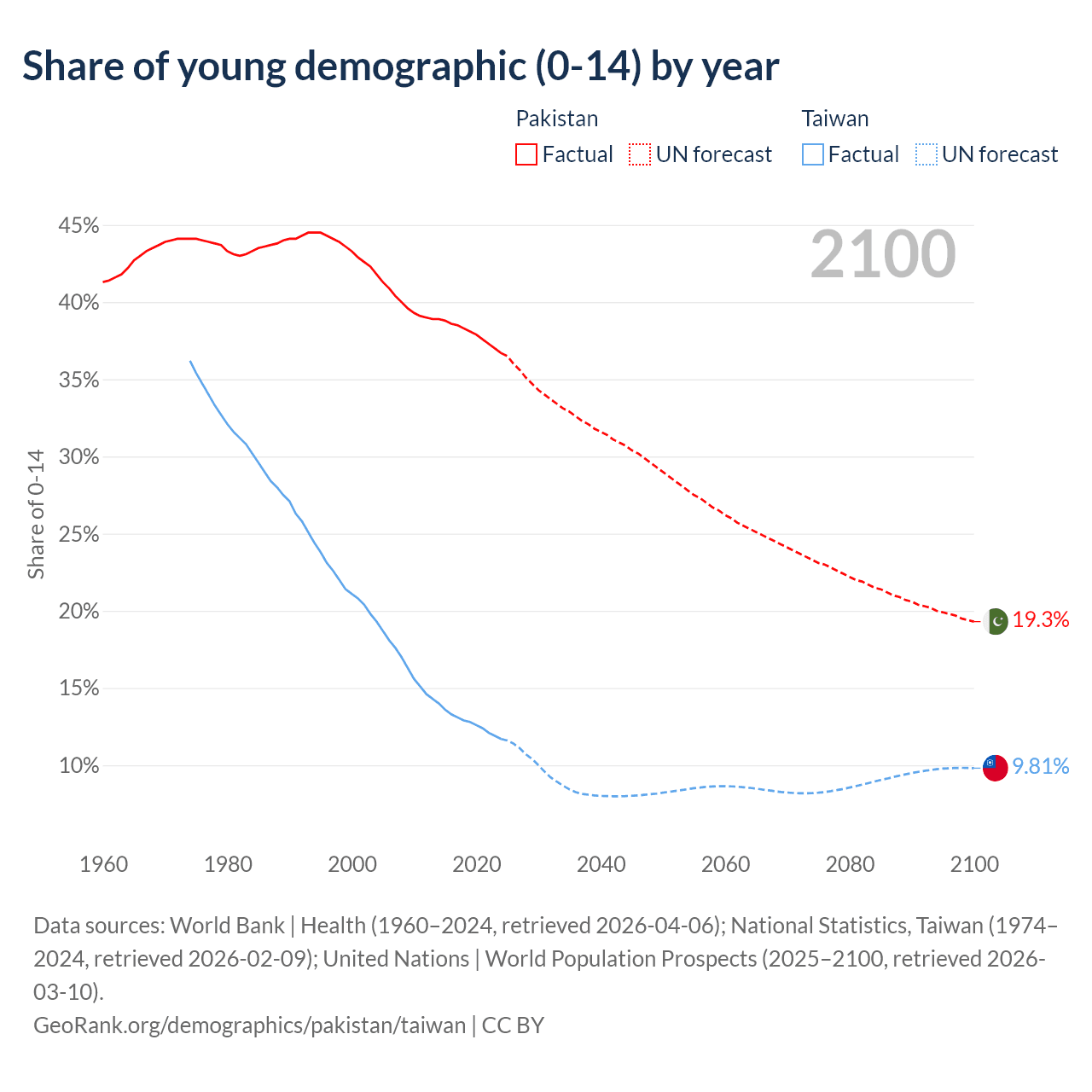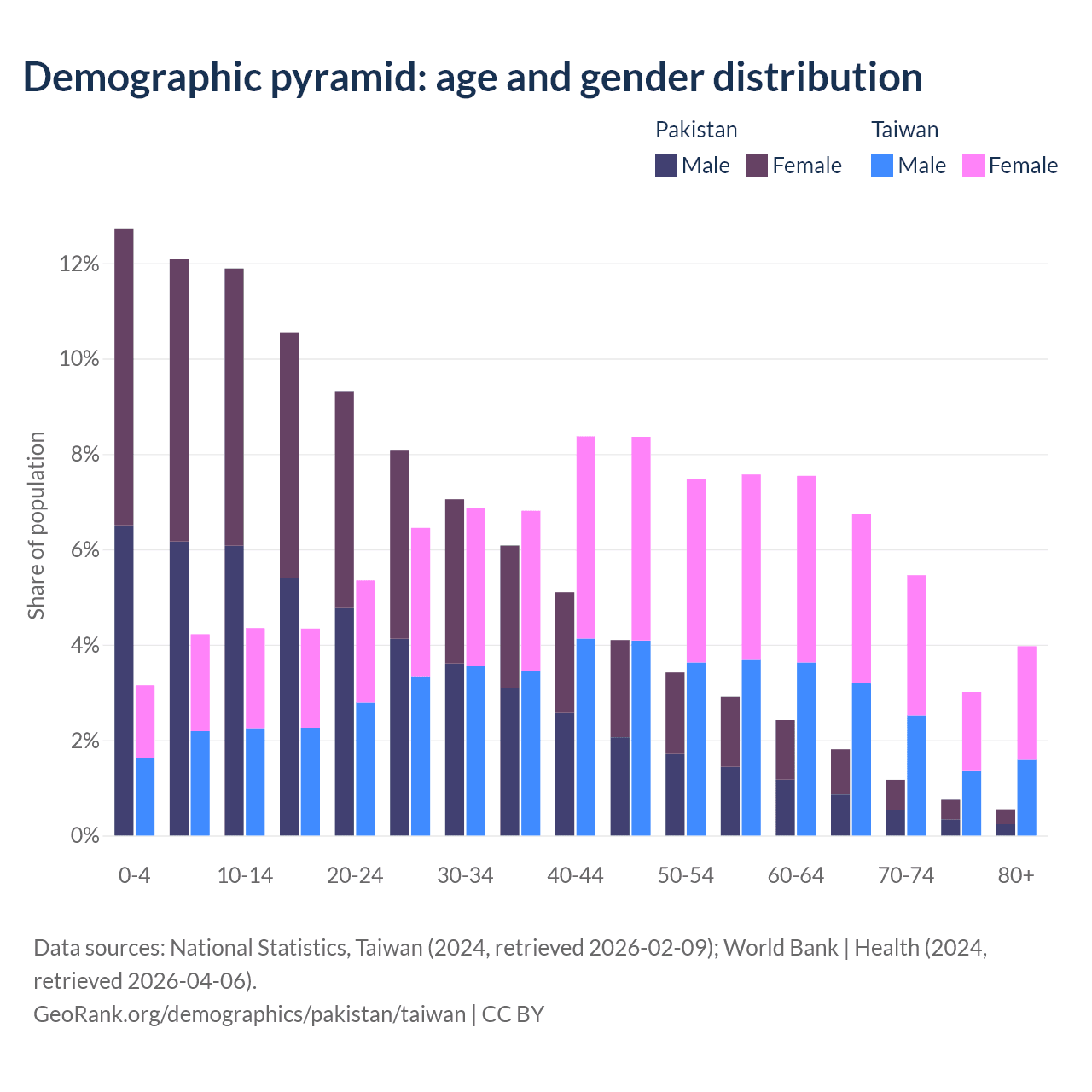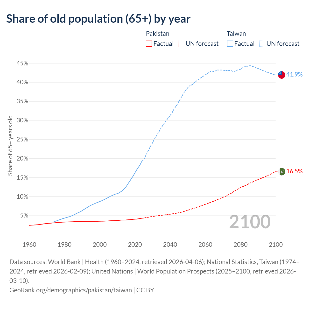 The share of older people aged 65 and over is 4.28% in Pakistan and 19.2% in Taiwan. Life expectancy in Pakistan compared to Taiwan .