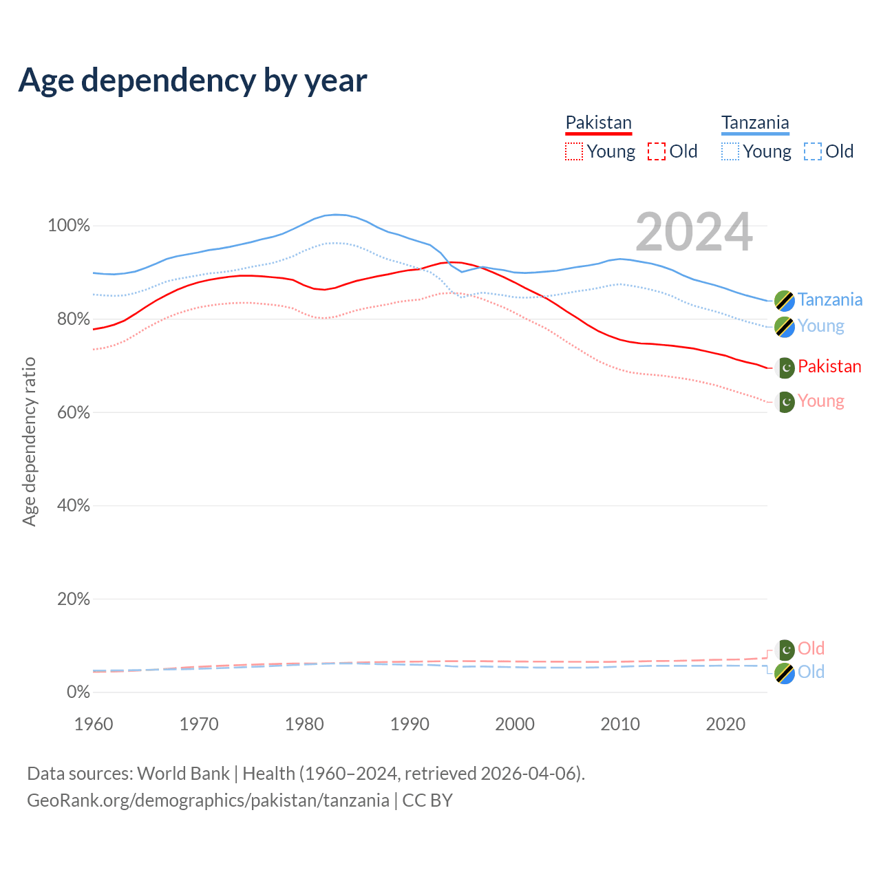 Data sources: World Bank | Health (1960–2024, retrieved 2026-04-06); U.S. Census Bureau (1960–2024, retrieved 2026-02-08).