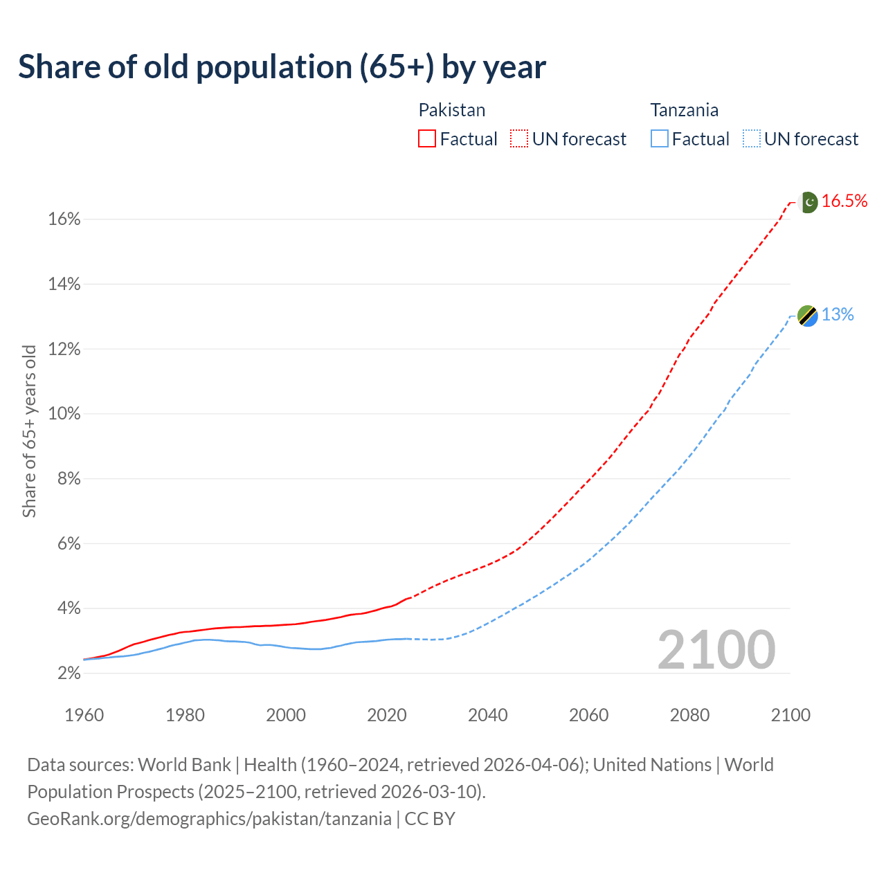 The share of older people aged 65 and over is 4.28% in Pakistan and 3.05% in Tanzania. Life expectancy in Pakistan compared to Tanzania .