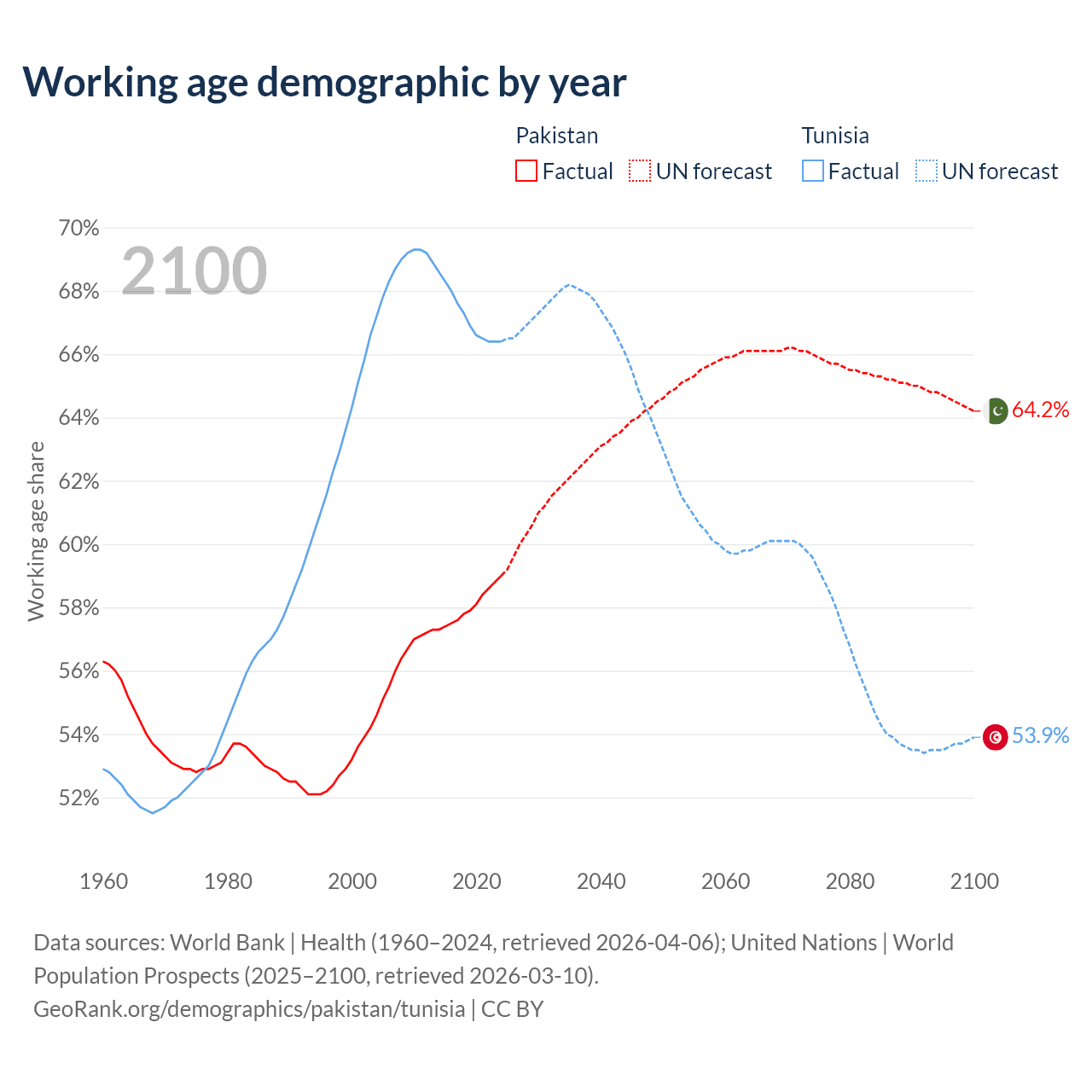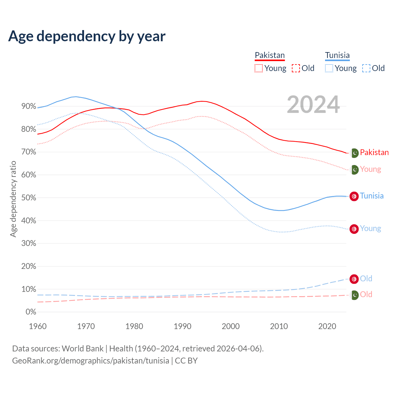 The share of older people aged 65 and over is 4.28% in Pakistan and 9.53% in Tunisia. Life expectancy in Pakistan compared to Tunisia .