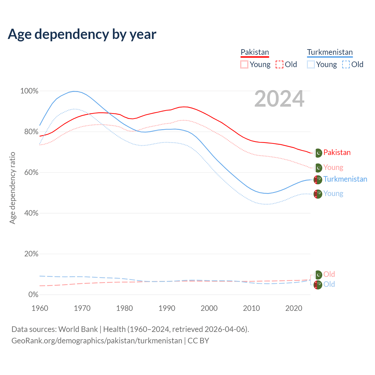 - Pakistan is ranked 154/196 by median age (oldest to youngest) vs 119/196 for Turkmenistan.