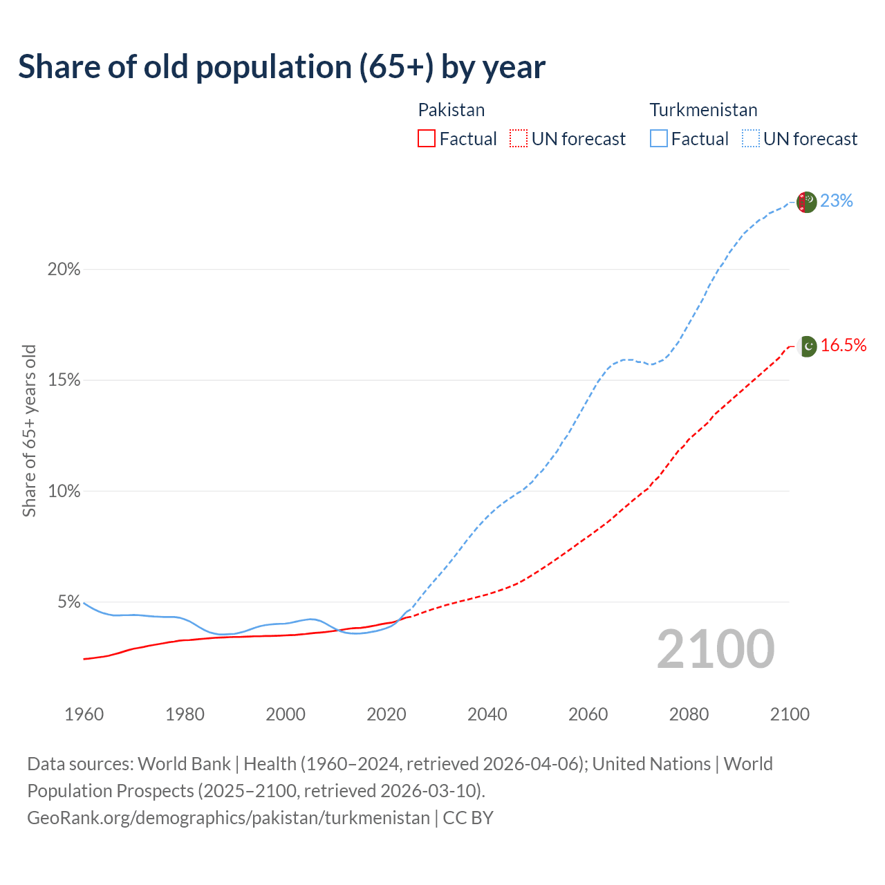 - The share of old-age demographic (65+) in Pakistan is 4.28% vs 4.53% in Turkmenistan.