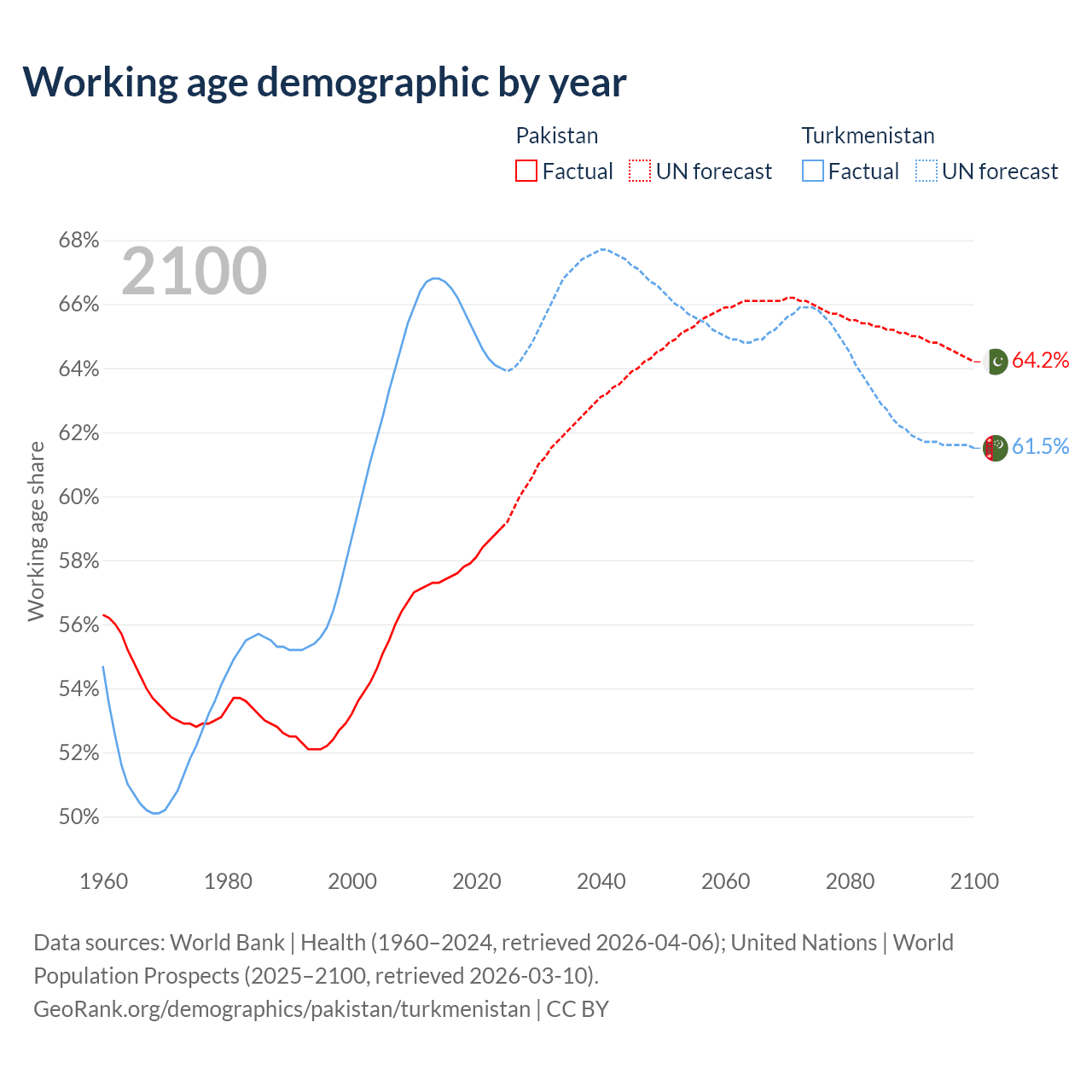 - Pakistan has 154M working age adults (aged 15-64) vs 4.97M in Turkmenistan.