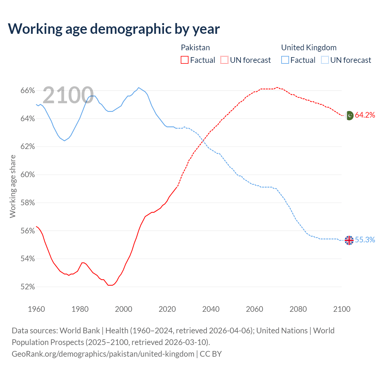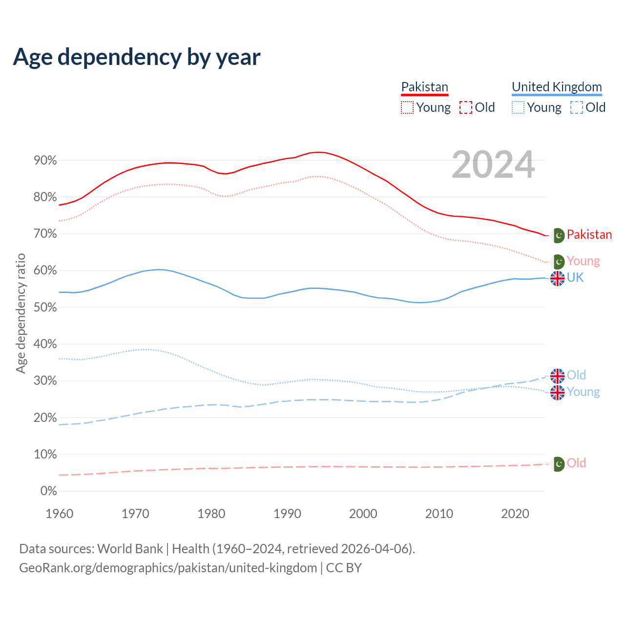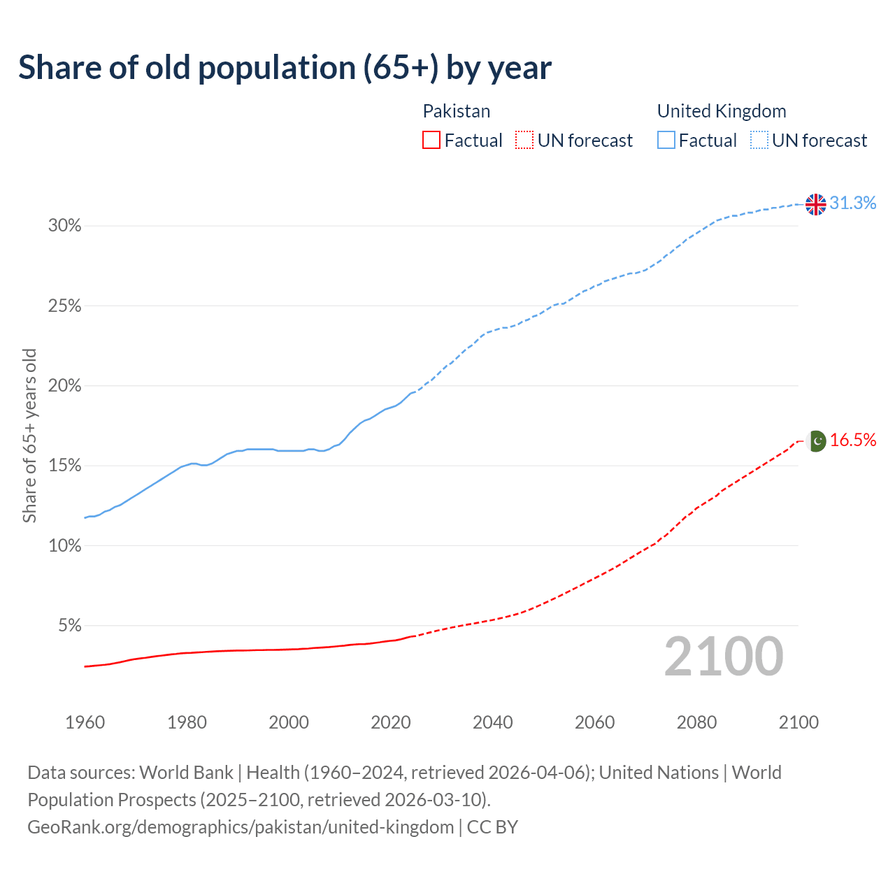 The share of older people aged 65 and over is 4.28% in Pakistan and 19.5% in the United Kingdom. Life expectancy in Pakistan compared to the United Kingdom .