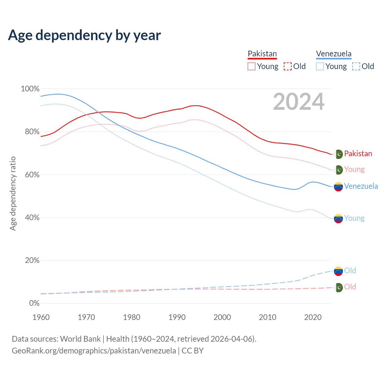 - Pakistan is ranked 154/196 by median age (oldest to youngest) vs 104/196 for Venezuela.