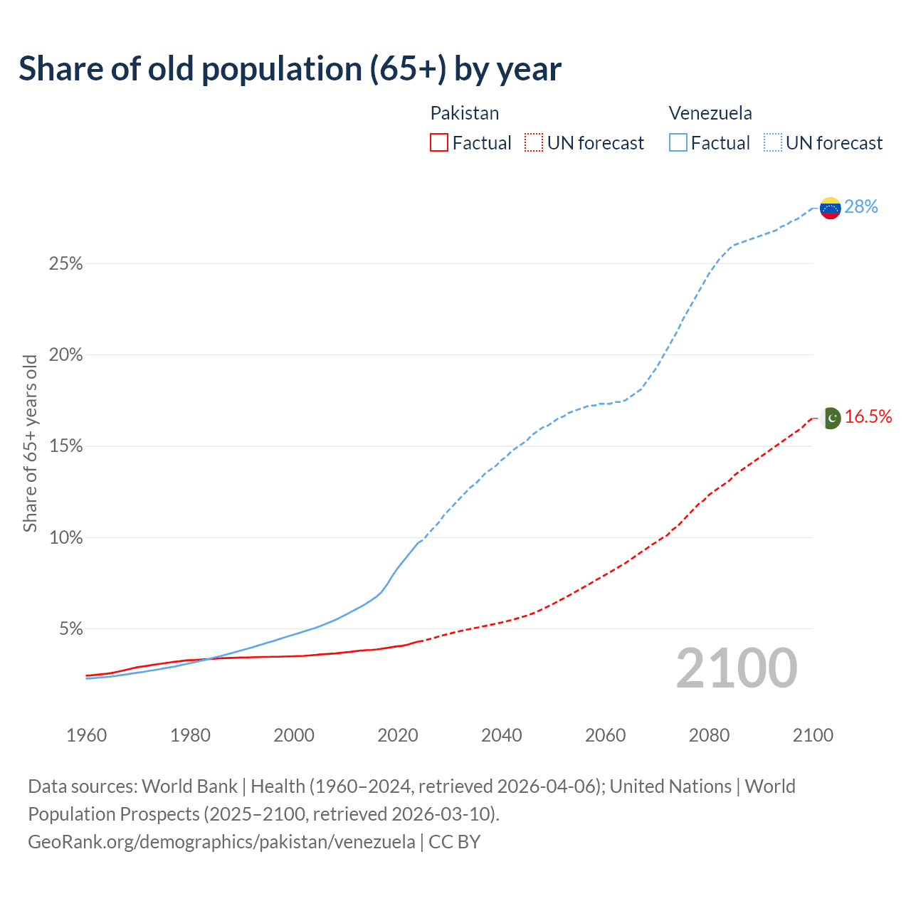 - The share of old-age demographic (65+) in Pakistan is 4.28% vs 9.68% in Venezuela.