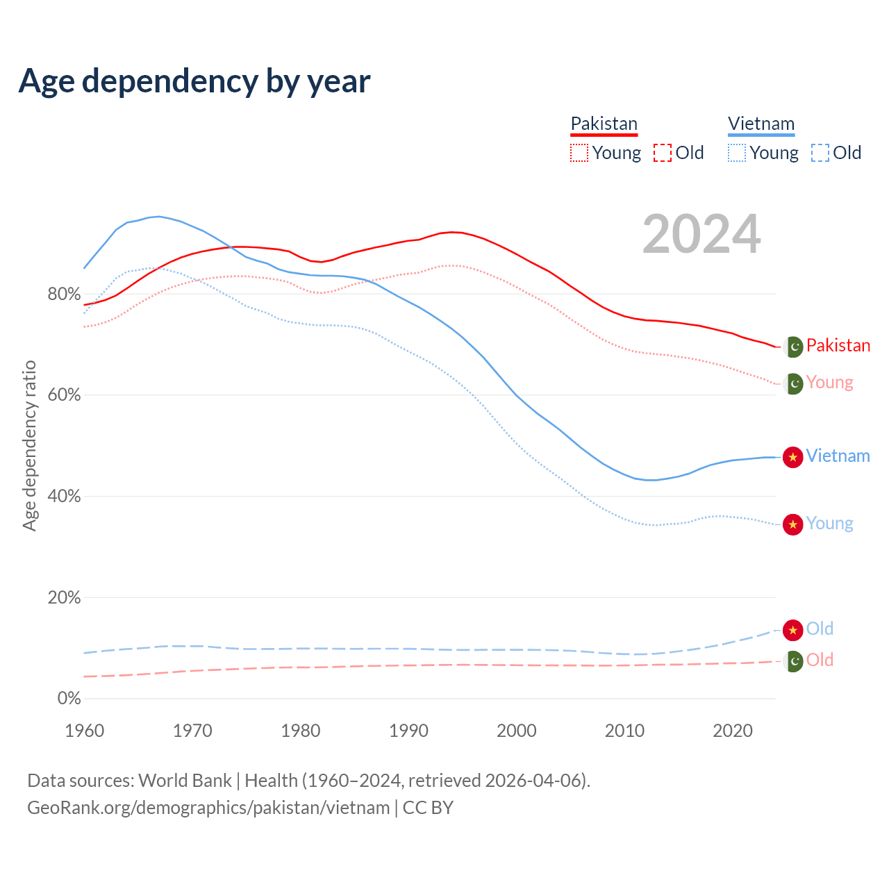 Data sources: World Bank | Health (1960–2024, retrieved 2026-04-06); U.S. Census Bureau (1960–2024, retrieved 2026-02-08).
