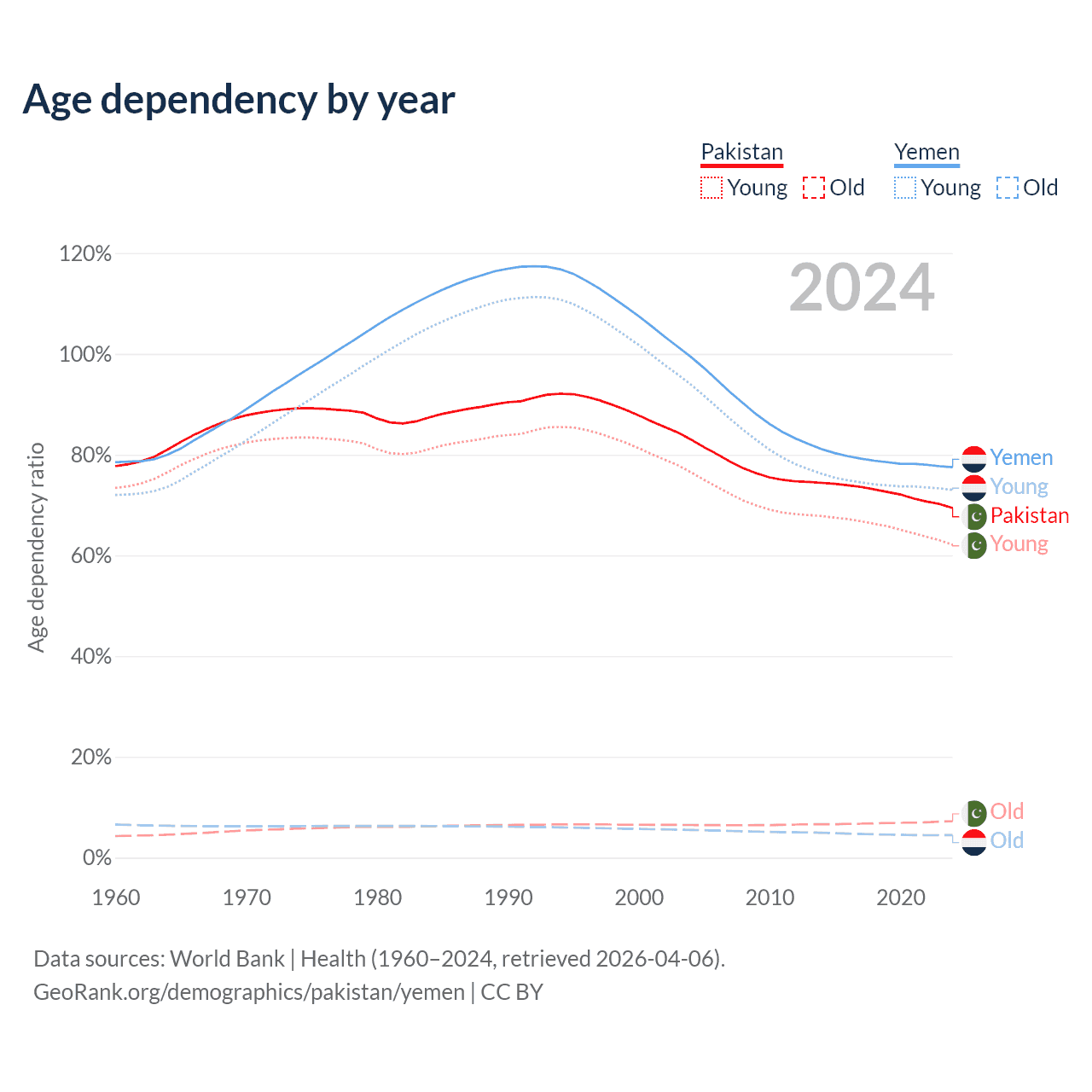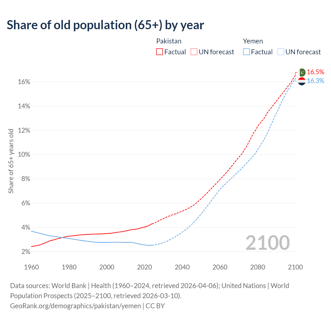- The share of old-age demographic (65+) in Pakistan is 4.28% vs 2.52% in Yemen.