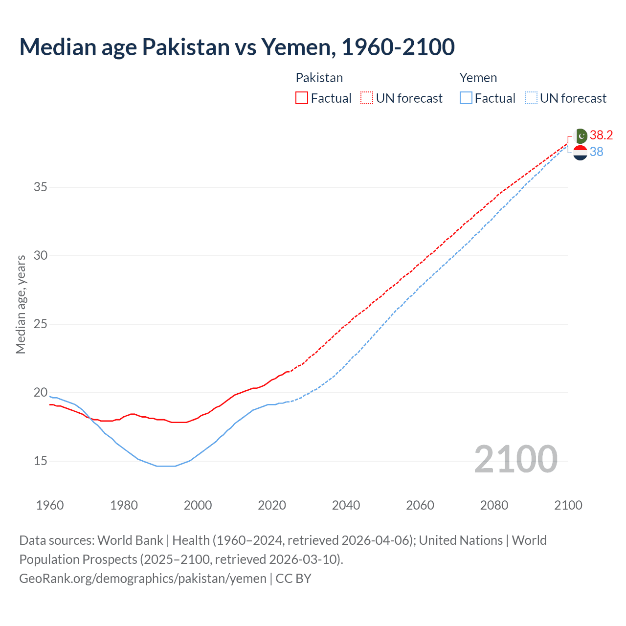 - The median age in Pakistan is 21.5 years compared to 19.3 years in Yemen.