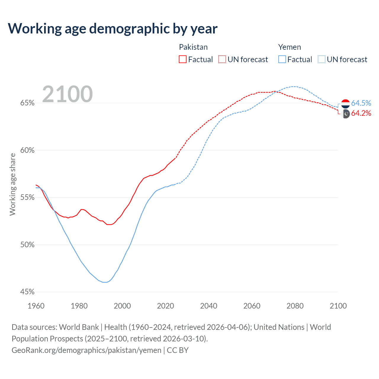 - Pakistan has 154M working age adults (aged 15-64) vs 24.4M in Yemen.