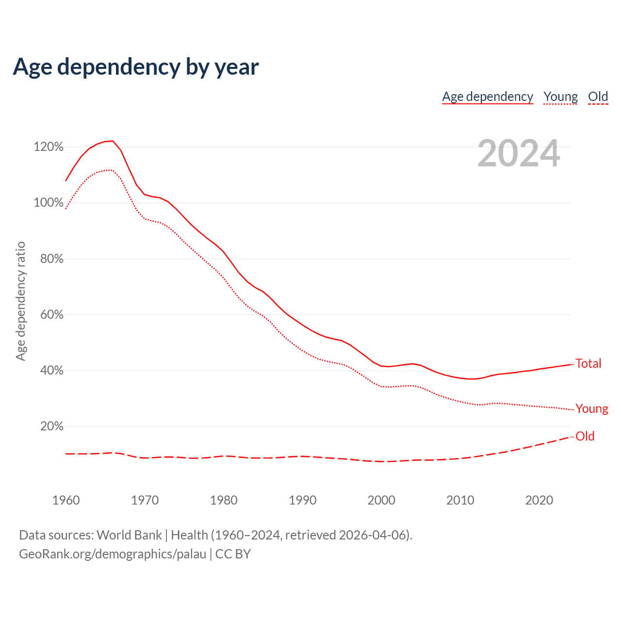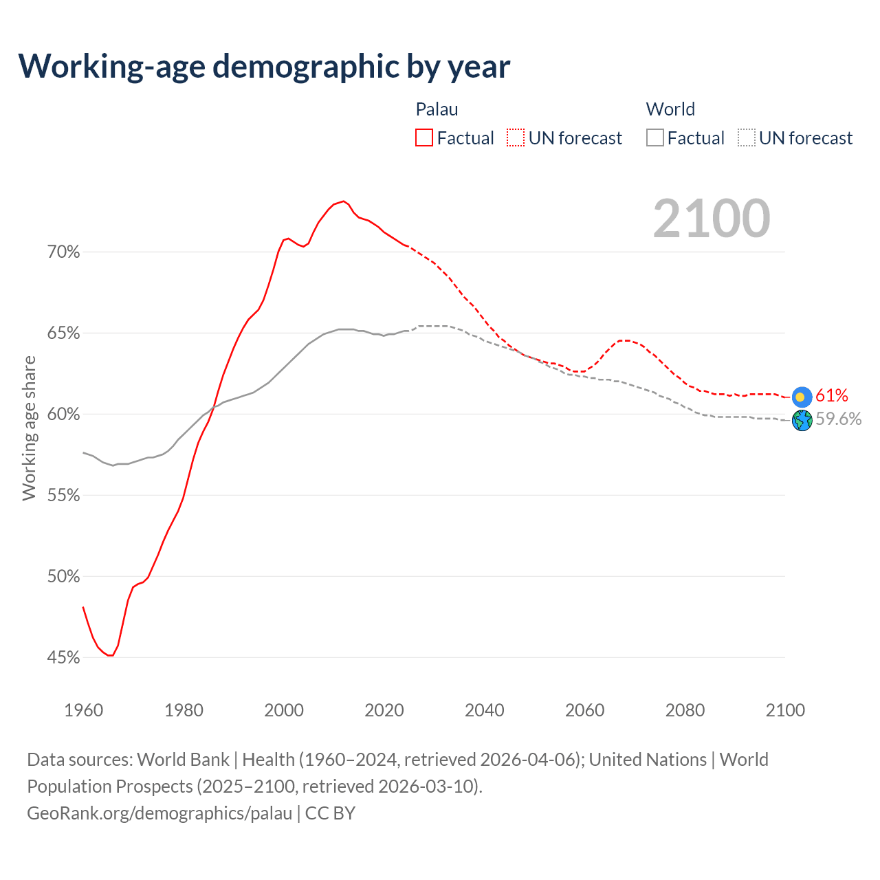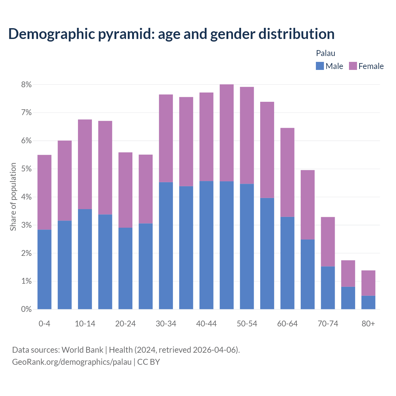 With a population of 17.7K people, Palau has a median age of 39.2 years which makes it the 53/196 oldest country. 18.2% of the demographic are children 0-14 years old, 70.4% are working-age people aged 15-64, and 11.3% are older population aged 65+ years.