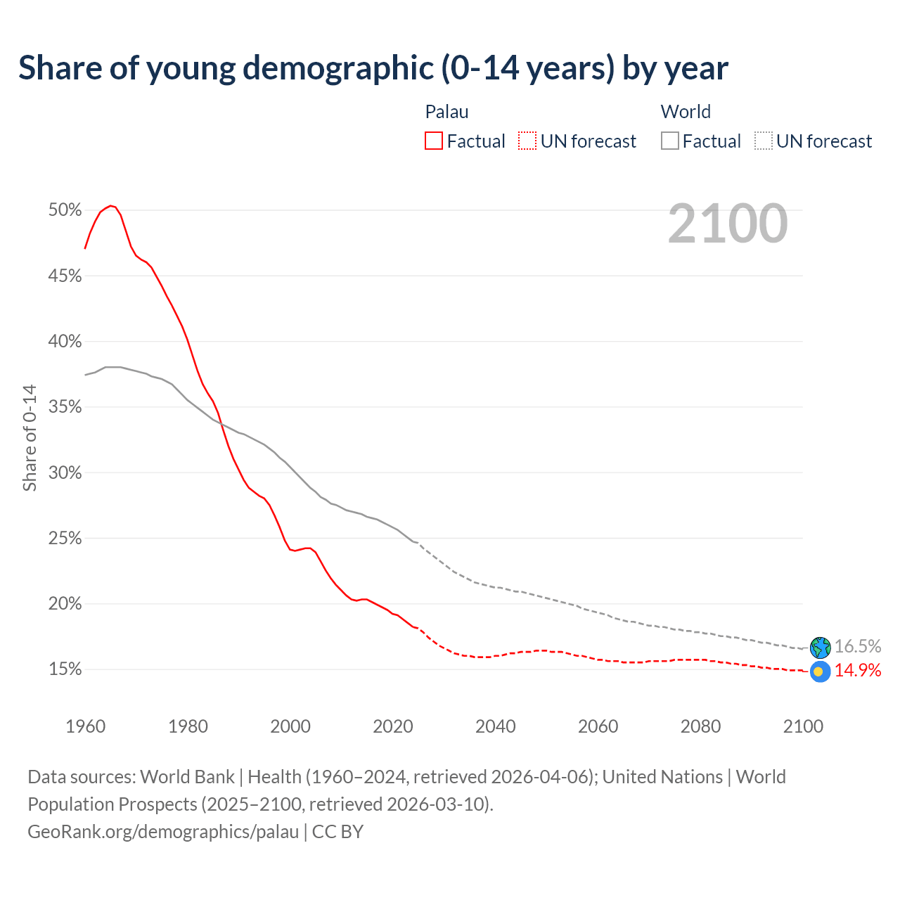 The share of children aged 0-14 in Palau decreased from 24.2% to 18.2% between 2004 and 2024 due to changes in birth rates.