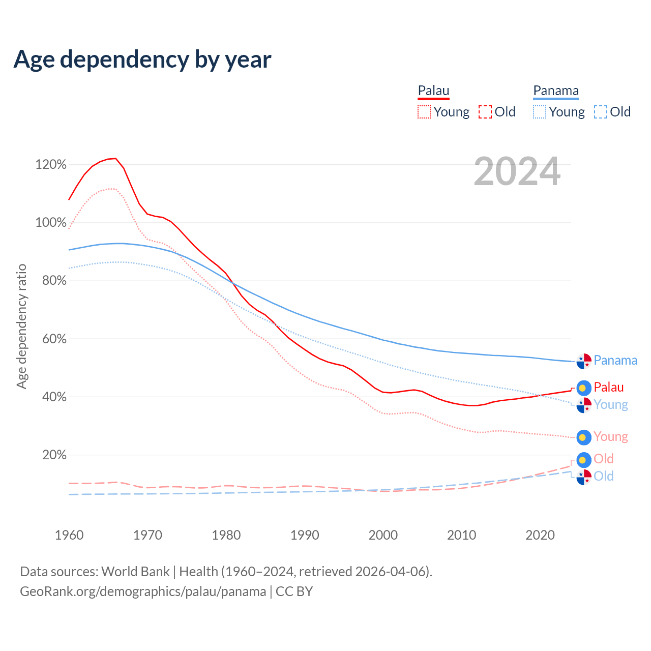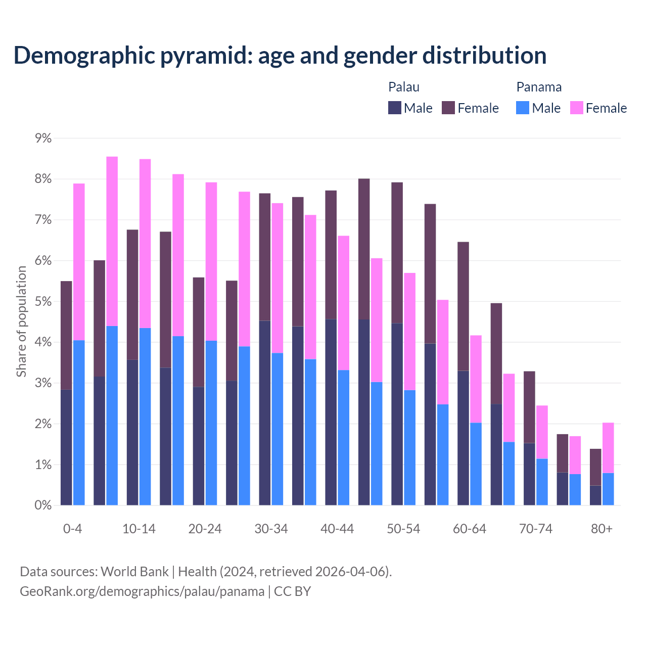 - Palau is ranked 53/196 by median age (oldest to youngest) vs 94/196 for Panama.