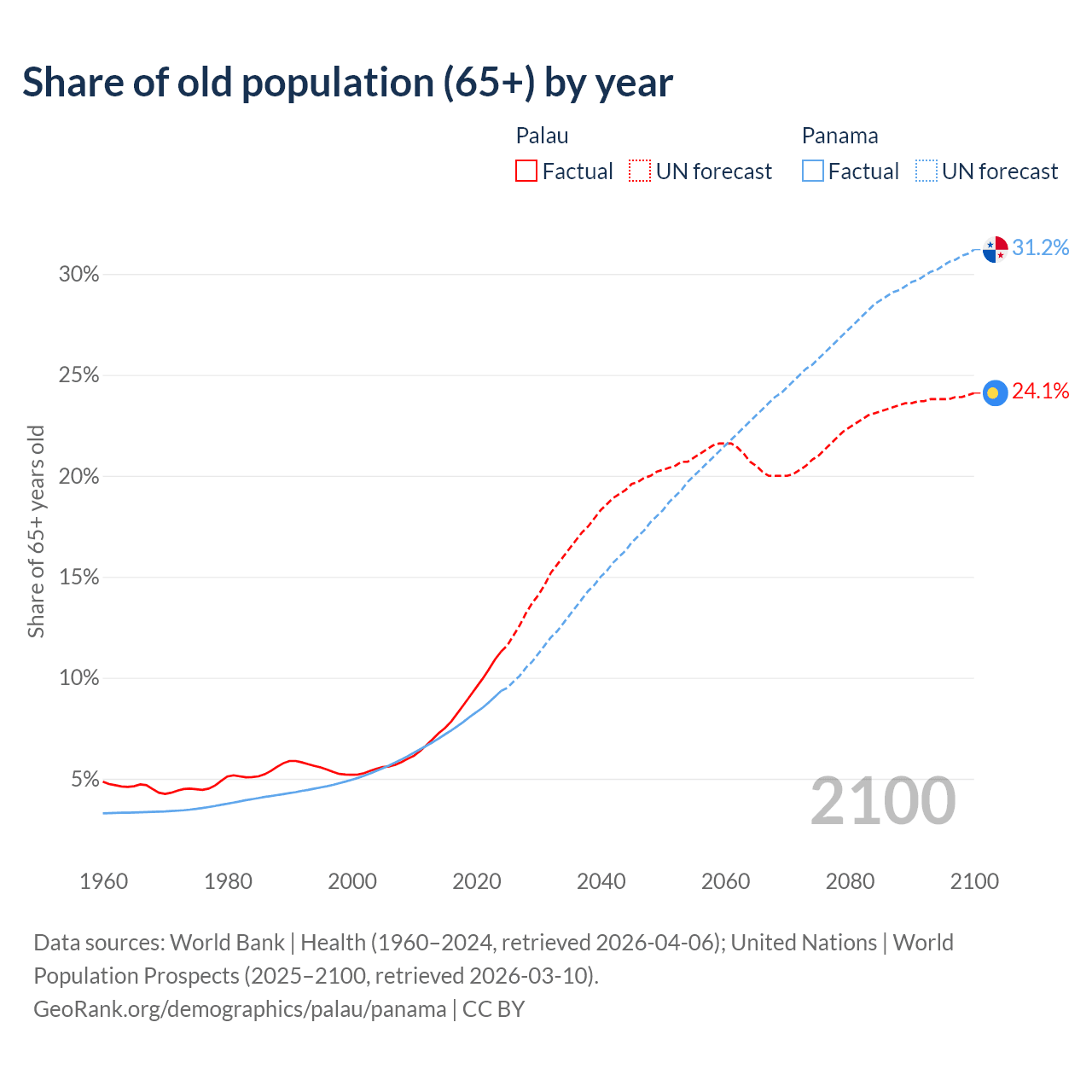 The share of older people aged 65 and over is 11.3% in Palau and 9.35% in Panama. Life expectancy in Palau compared to Panama .