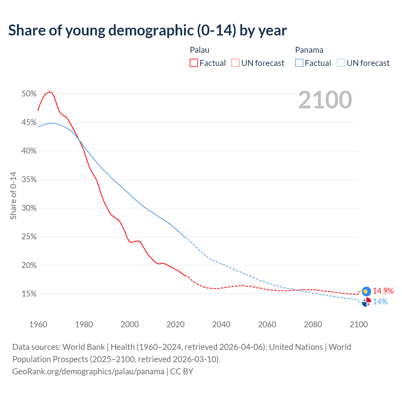 - The share of young demographic (0-15 years old) in Palau is 18.2% vs 24.9% in Panama.