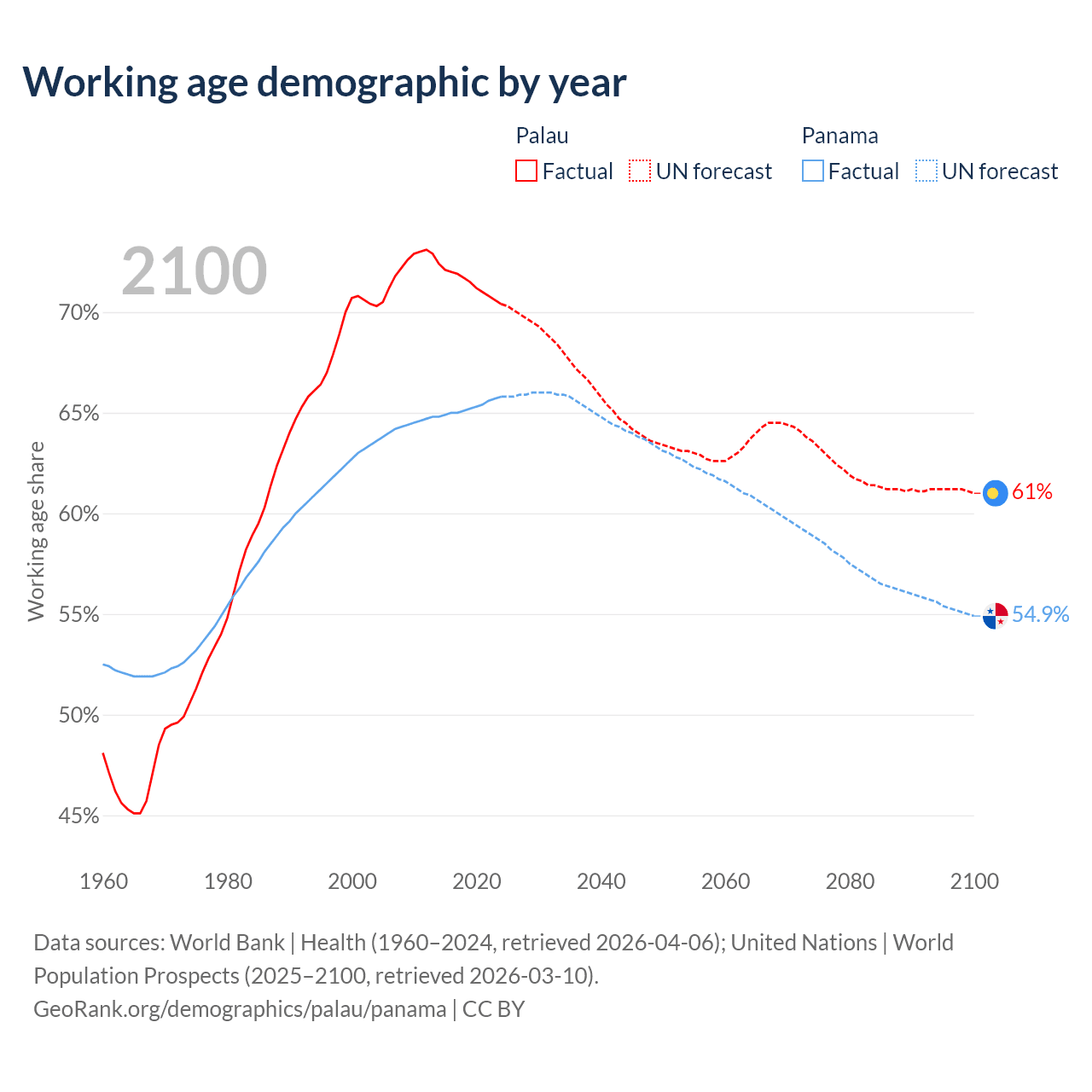 - Palau has 12.4K working age adults (aged 15-64) vs 3.05M in Panama.