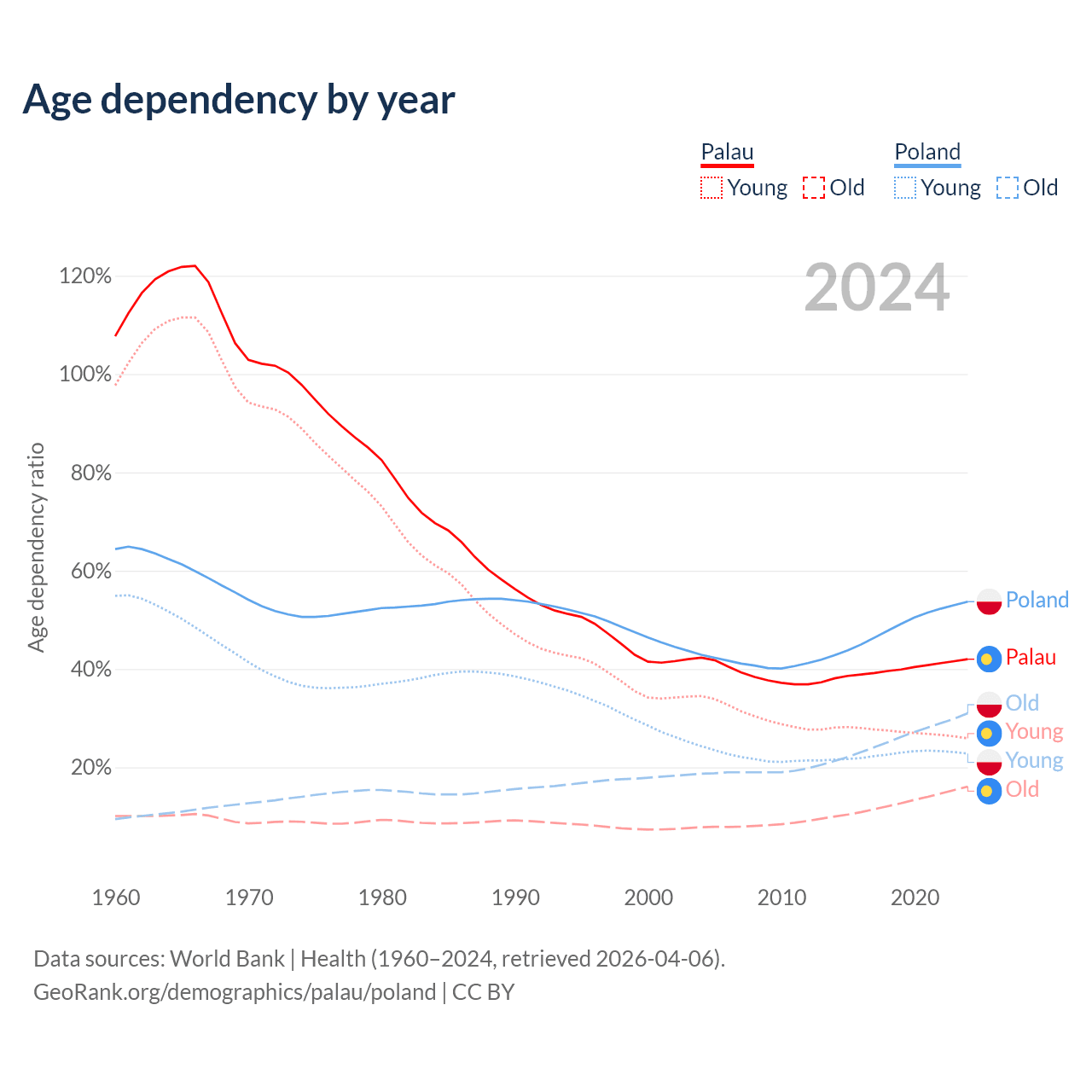 - The share of young demographic (0-15 years old) in Palau is 18.2% vs 14.8% in Poland.