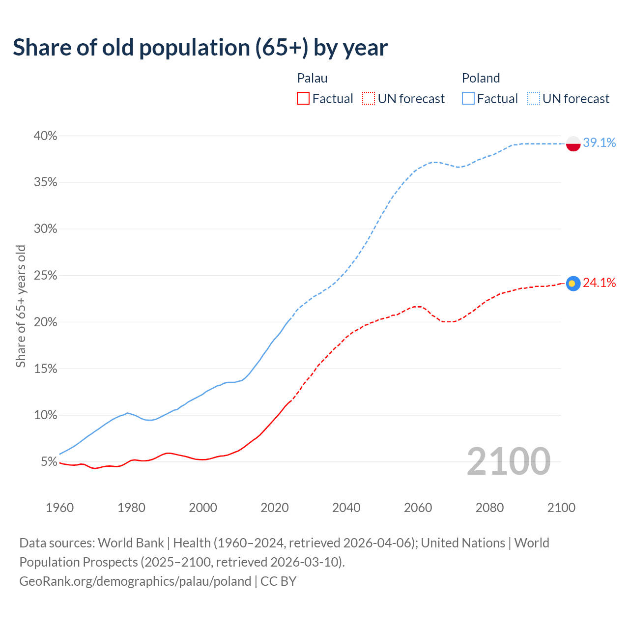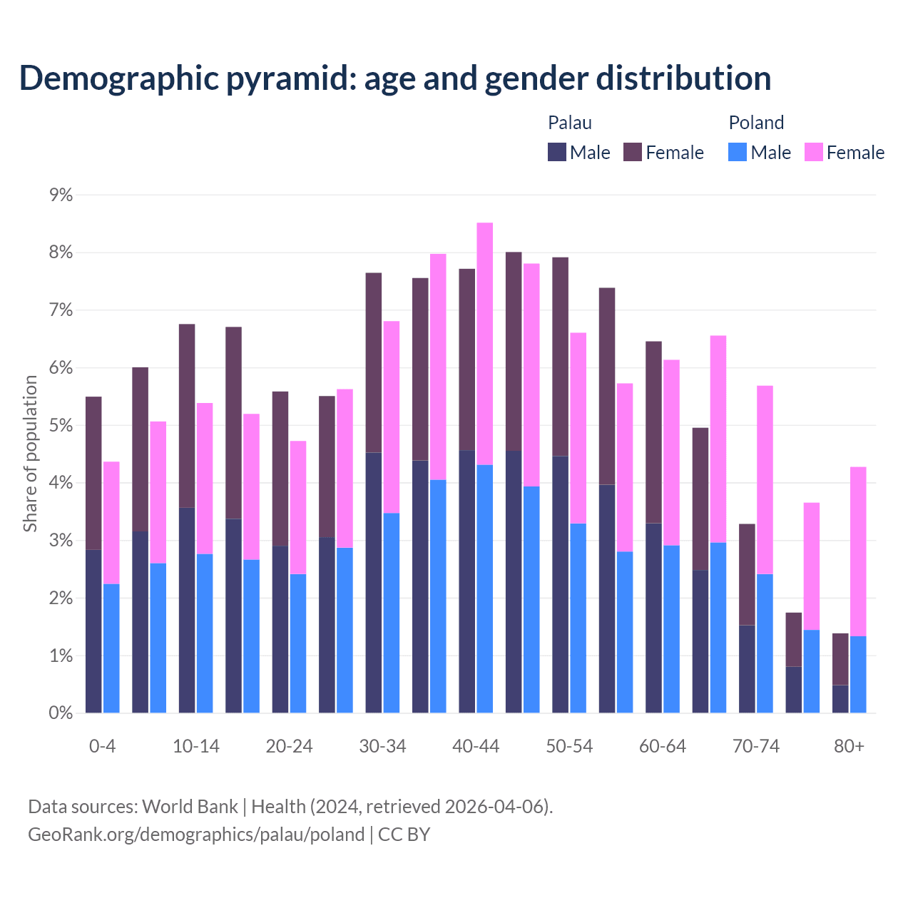 - The share of old-age demographic (65+) in Palau is 11.3% vs 20.1% in Poland.