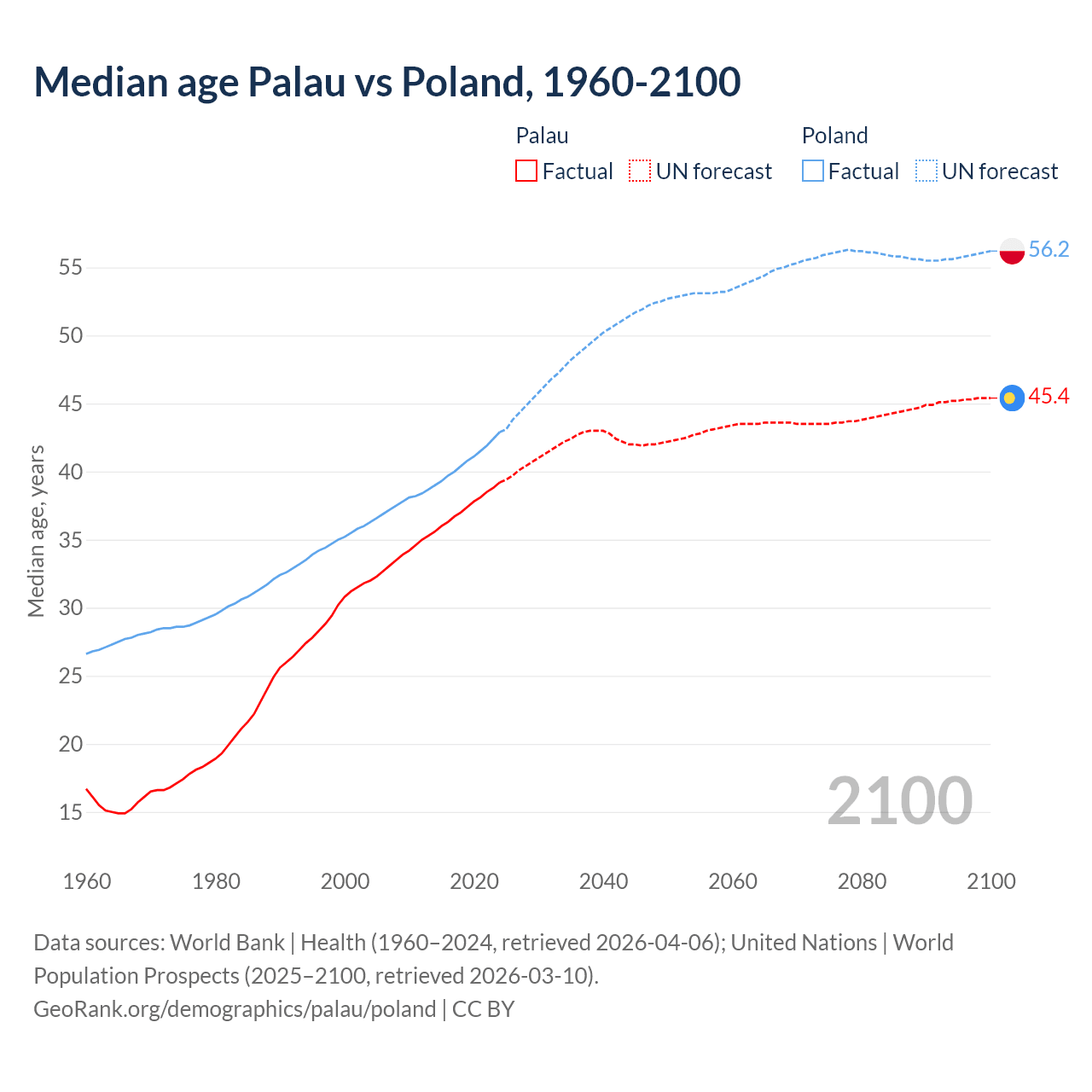 Median age Palau vs Poland, 1960-2100