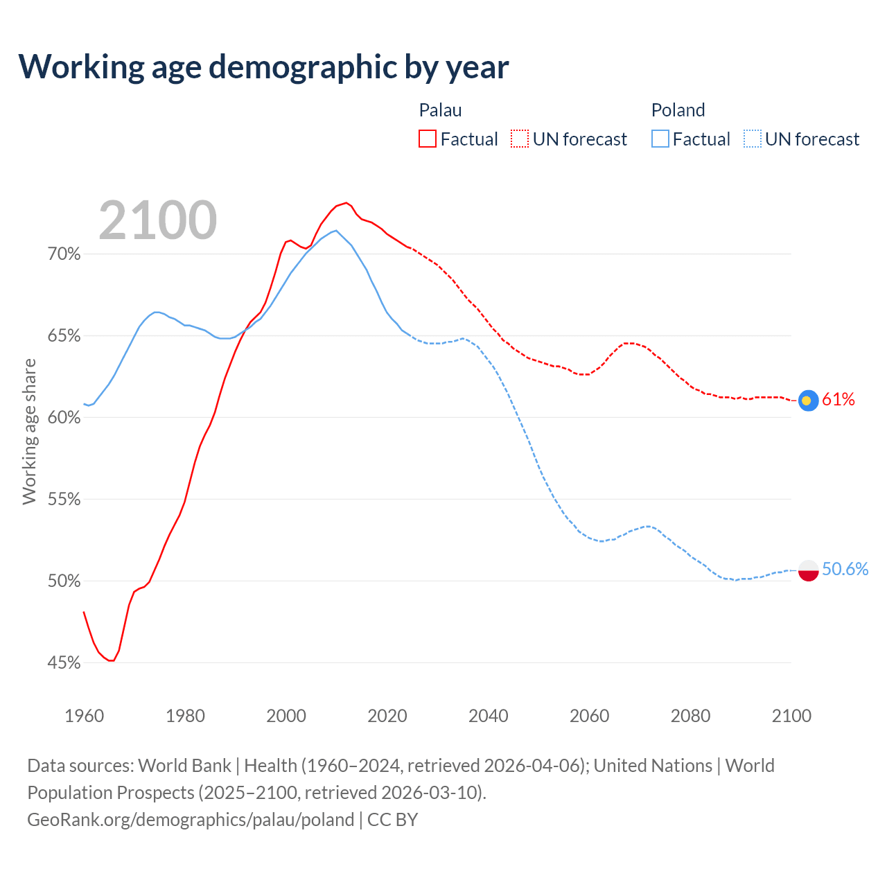 The share of older people aged 65 and over is 11.3% in Palau and 20.1% in Poland. Life expectancy in Palau compared to Poland .