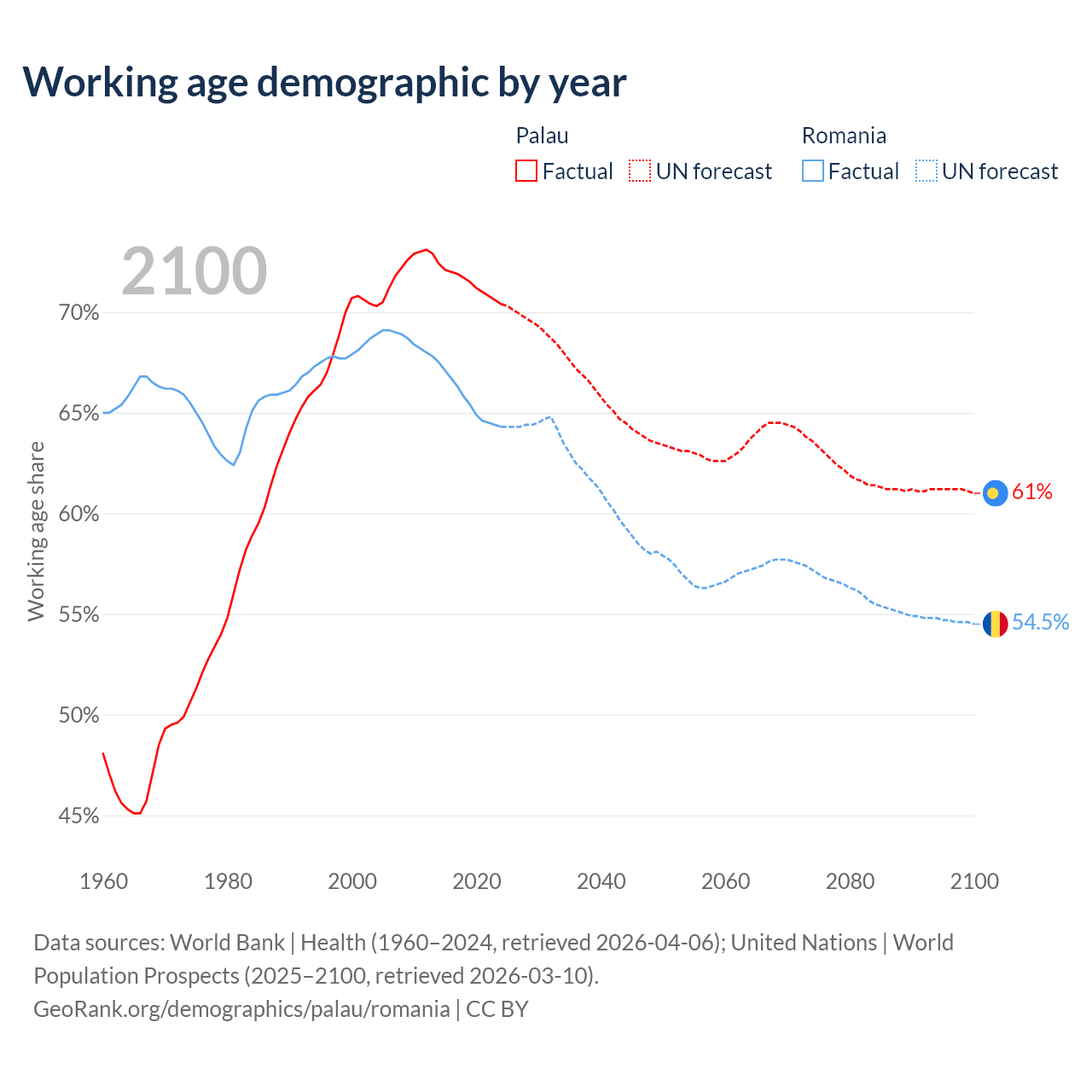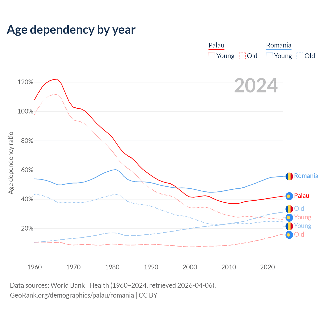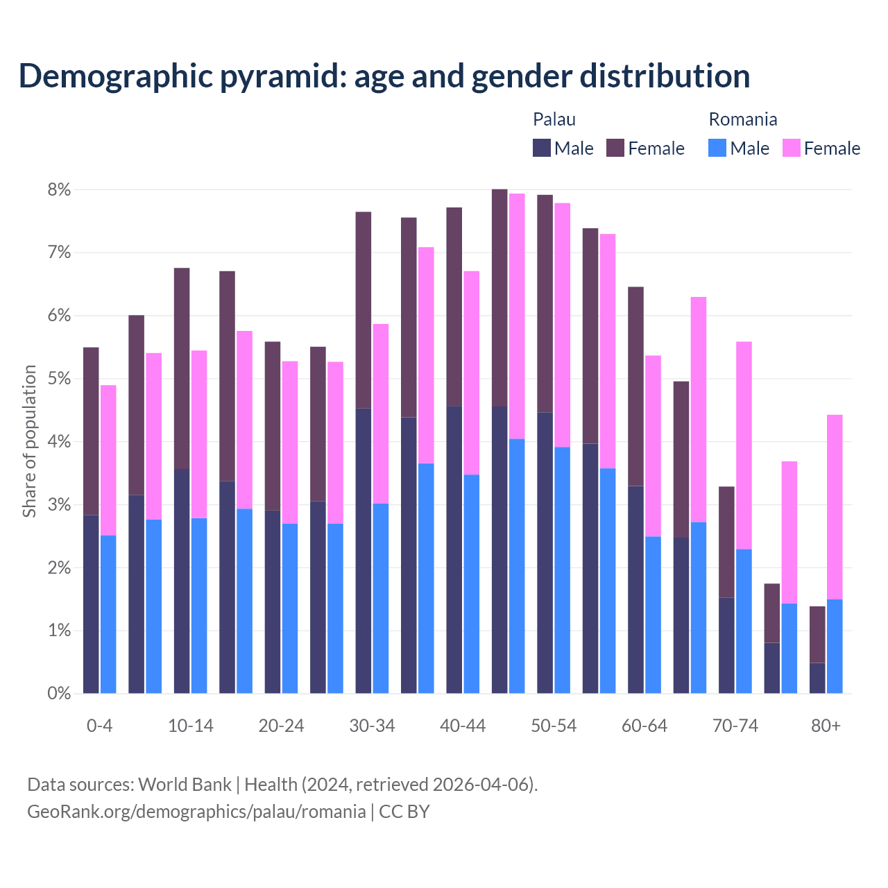- The share of young demographic (0-15 years old) in Palau is 18.2% vs 15.7% in Romania.