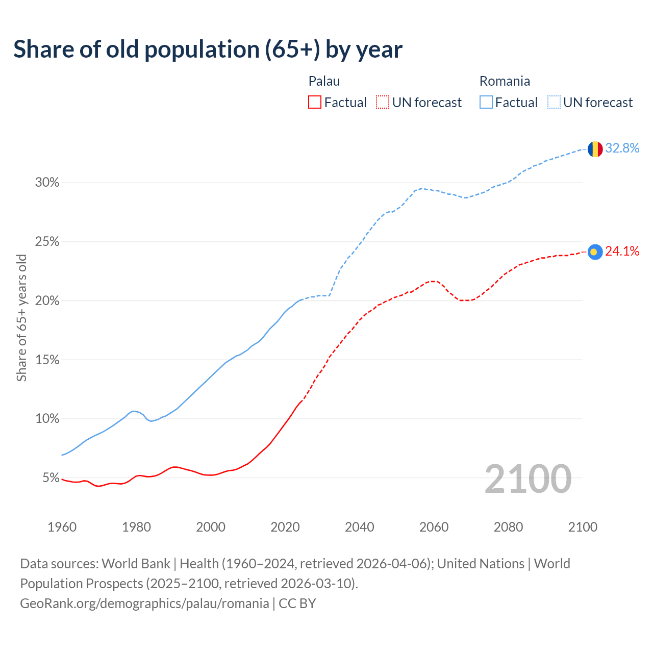 The share of older people aged 65 and over is 11.3% in Palau and 20% in Romania. Life expectancy in Palau compared to Romania .