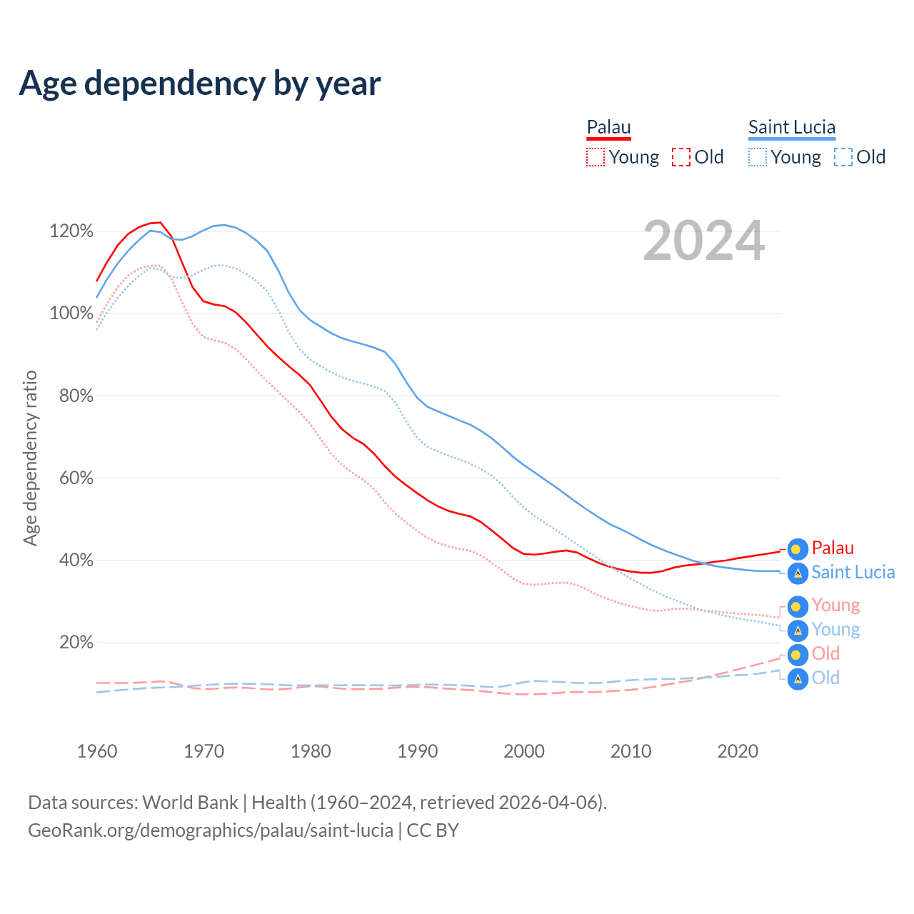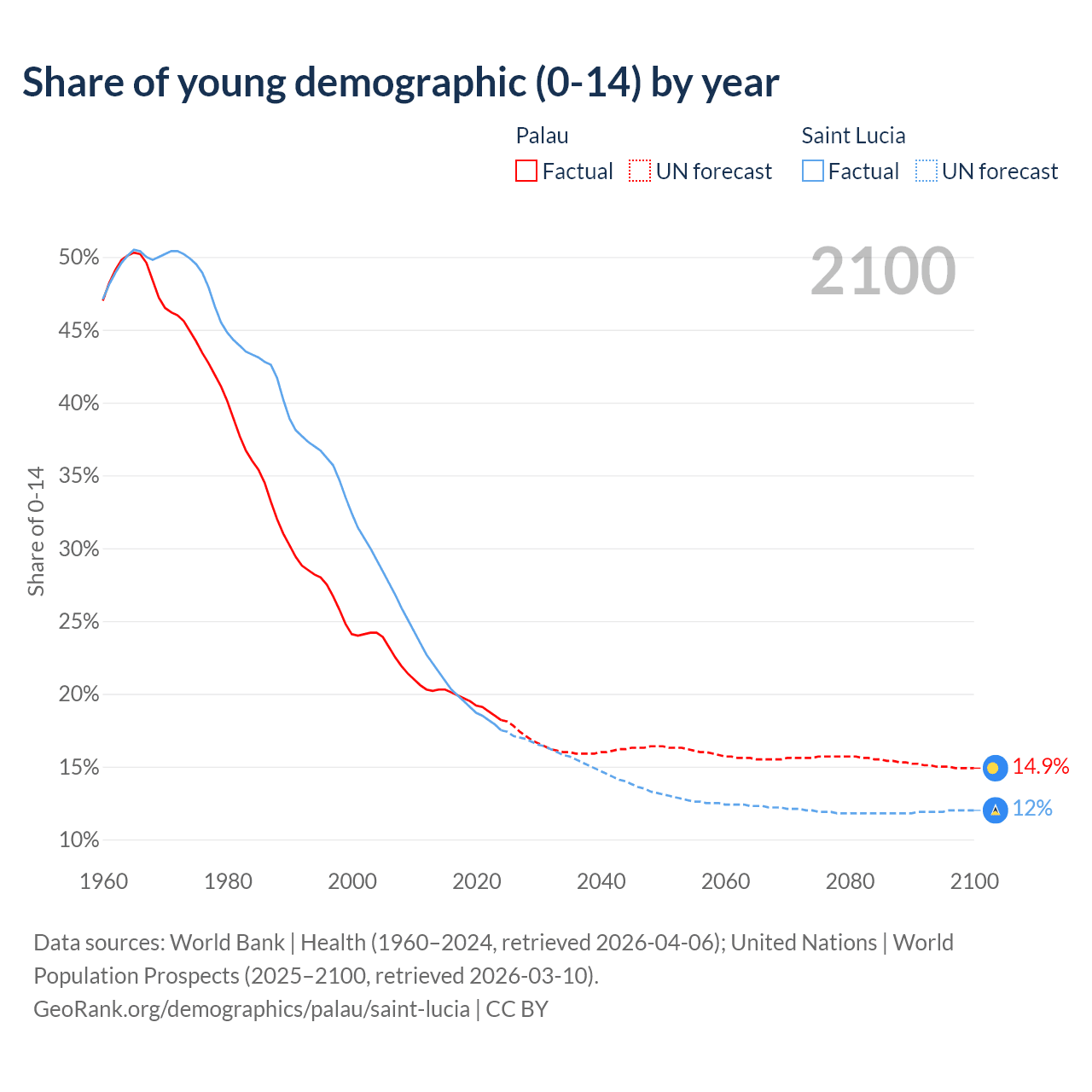 - The share of young demographic (0-15 years old) in Palau is 18.2% vs 17.5% in Saint Lucia.