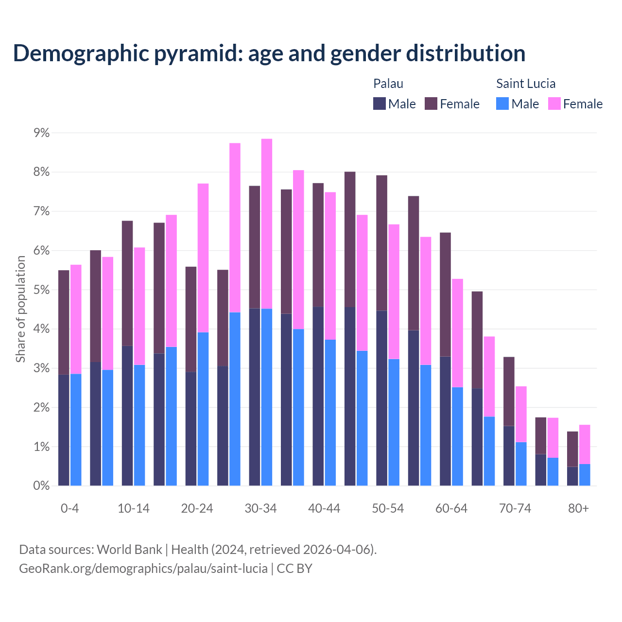 - Palau is ranked 53/196 by median age (oldest to youngest) vs 74/196 for Saint Lucia.
