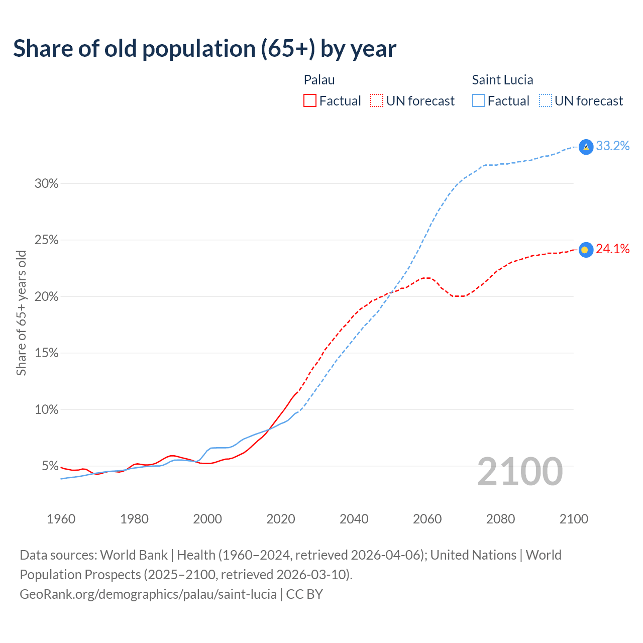- The share of old-age demographic (65+) in Palau is 11.3% vs 9.62% in Saint Lucia.