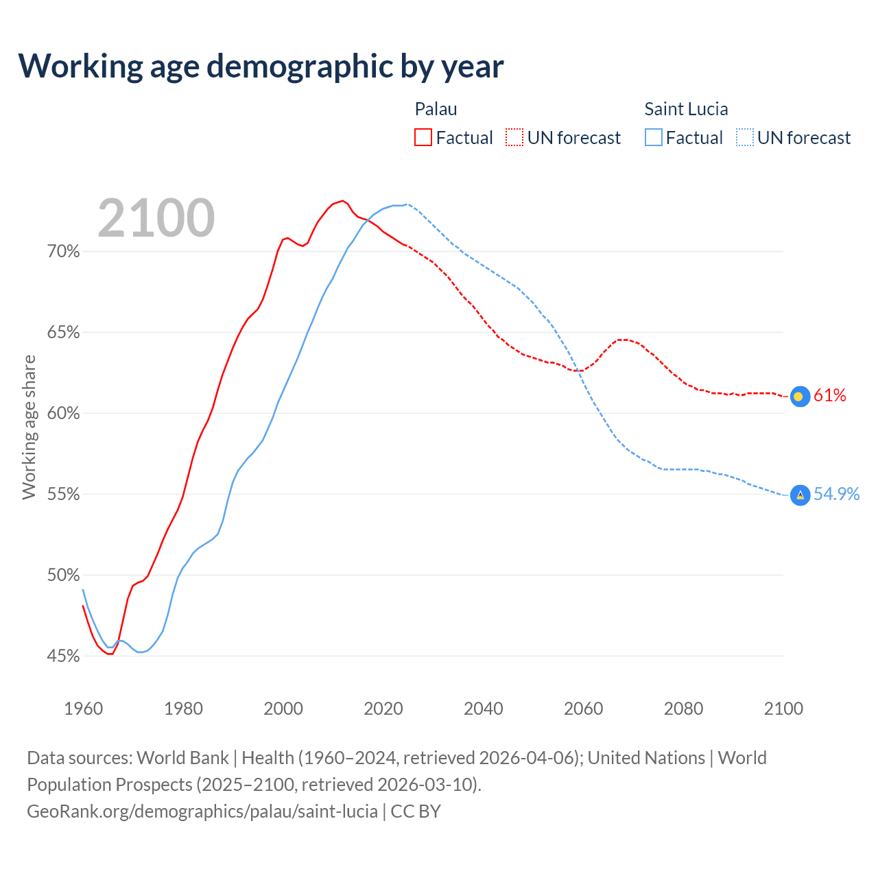 - Palau has 12.4K working age adults (aged 15-64) vs 132K in Saint Lucia.
