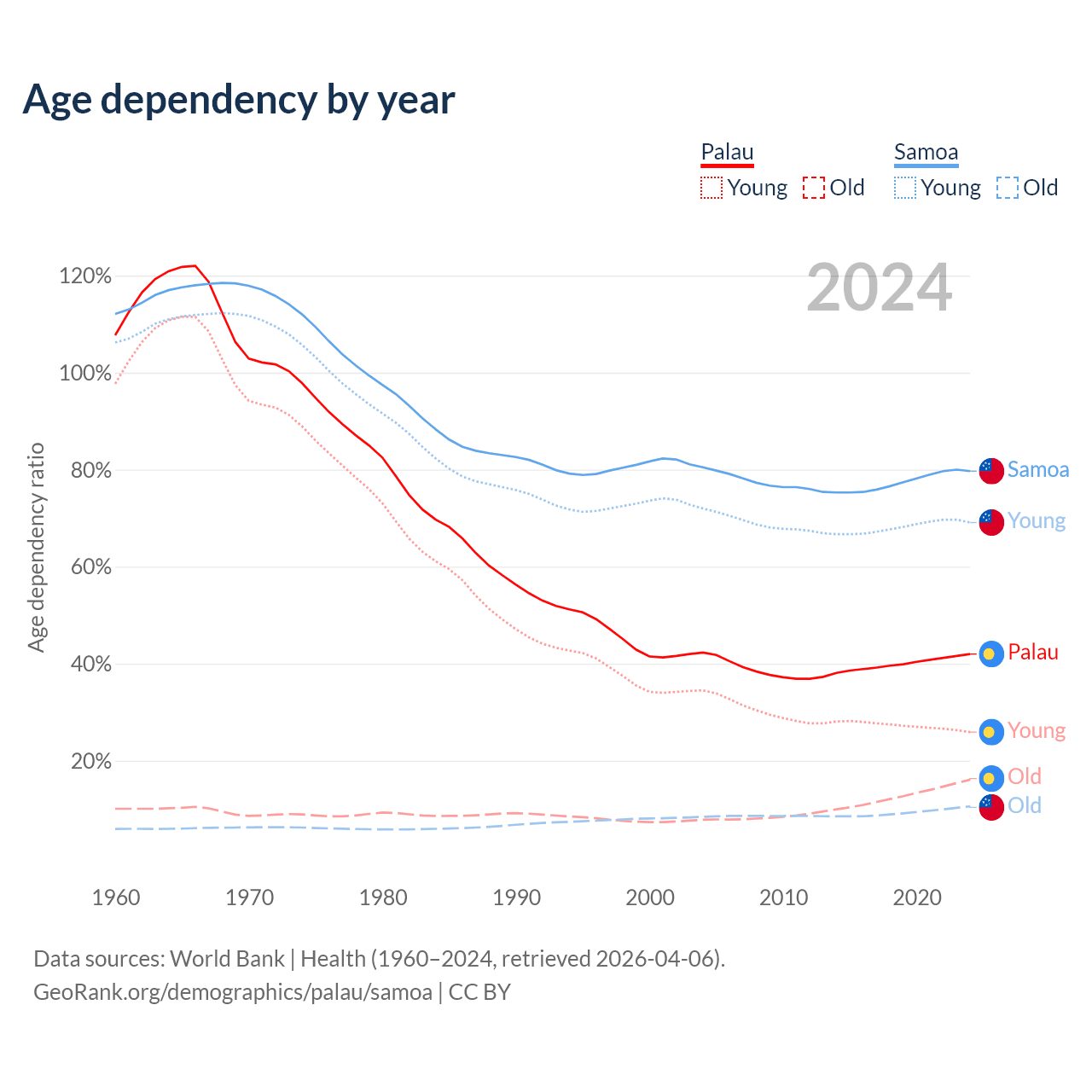 - The share of old-age demographic (65+) in Palau is 11.3% vs 5.88% in Samoa.