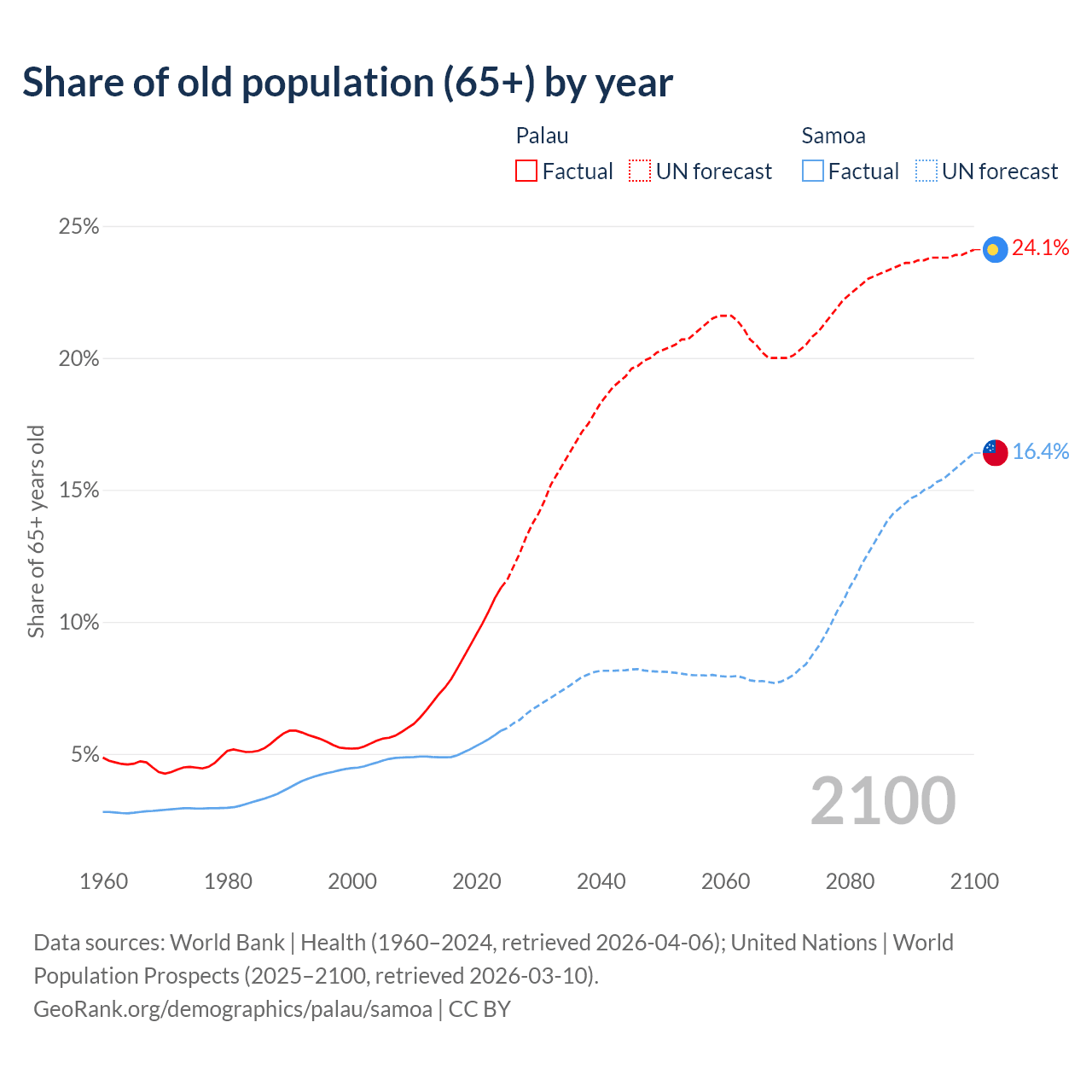 The share of older people aged 65 and over is 11.3% in Palau and 5.88% in Samoa. Life expectancy in Palau compared to Samoa .