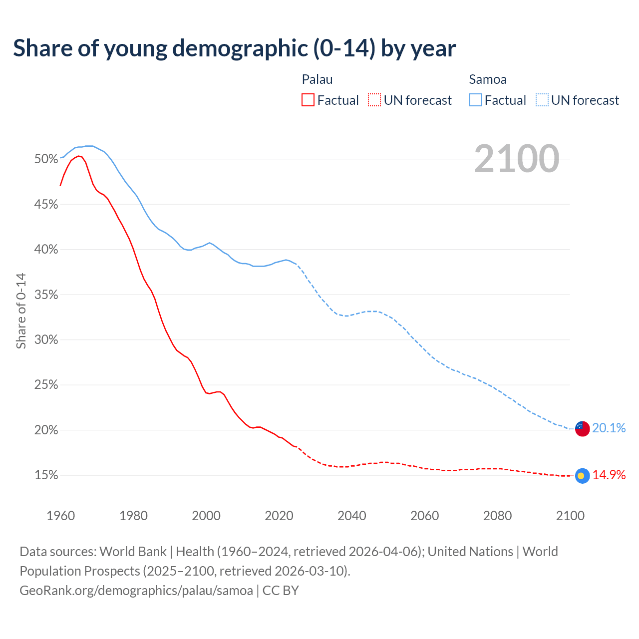 - The share of young demographic (0-15 years old) in Palau is 18.2% vs 38.5% in Samoa.