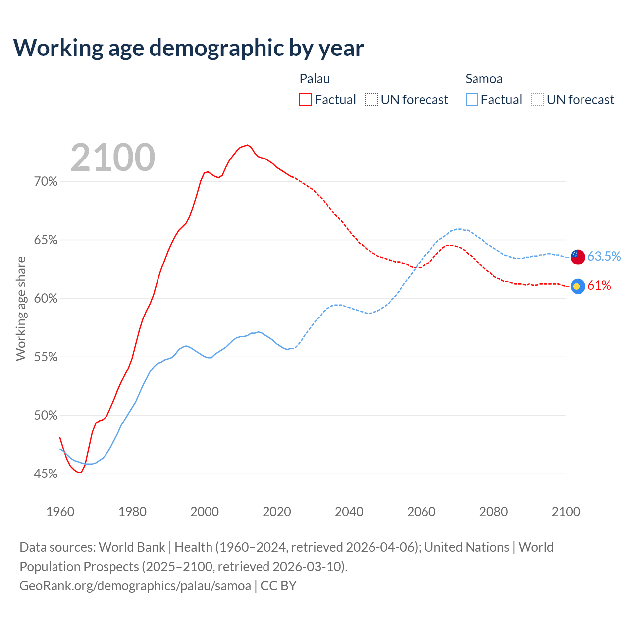 Median age Palau vs Samoa, 1960-2100
